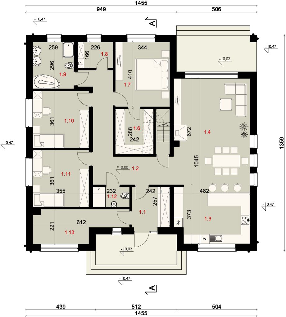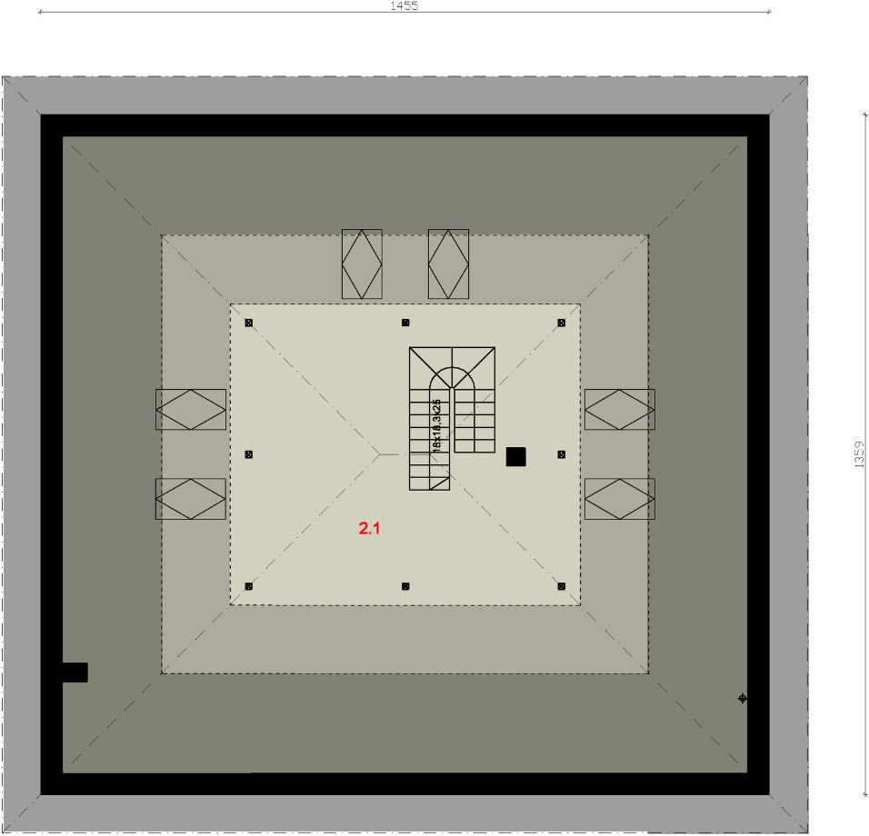 Graficzne opracowanie rzutów poglądowych widocznych na karcie projektu zostało wykonane przez Extradom.pl. Prezentowane przez Extradom.pl wizualizacje wykonane zostały przez autora projektu i należy poczytywać je jedynie za przykład i propozycję wykończenia, wizję architektoniczną autora projektu. Ostateczne wykończenie budynku może nastąpić na wiele sposobów. Szczegółowe rozwiązania zastosowane w oferowanej dokumentacji - w tym również ilość, lokalizacje i wygląd okien, drzwi, kominów - mogą w niewielkim stopniu różnić się od prezentowanej wizualizacji budynku.
