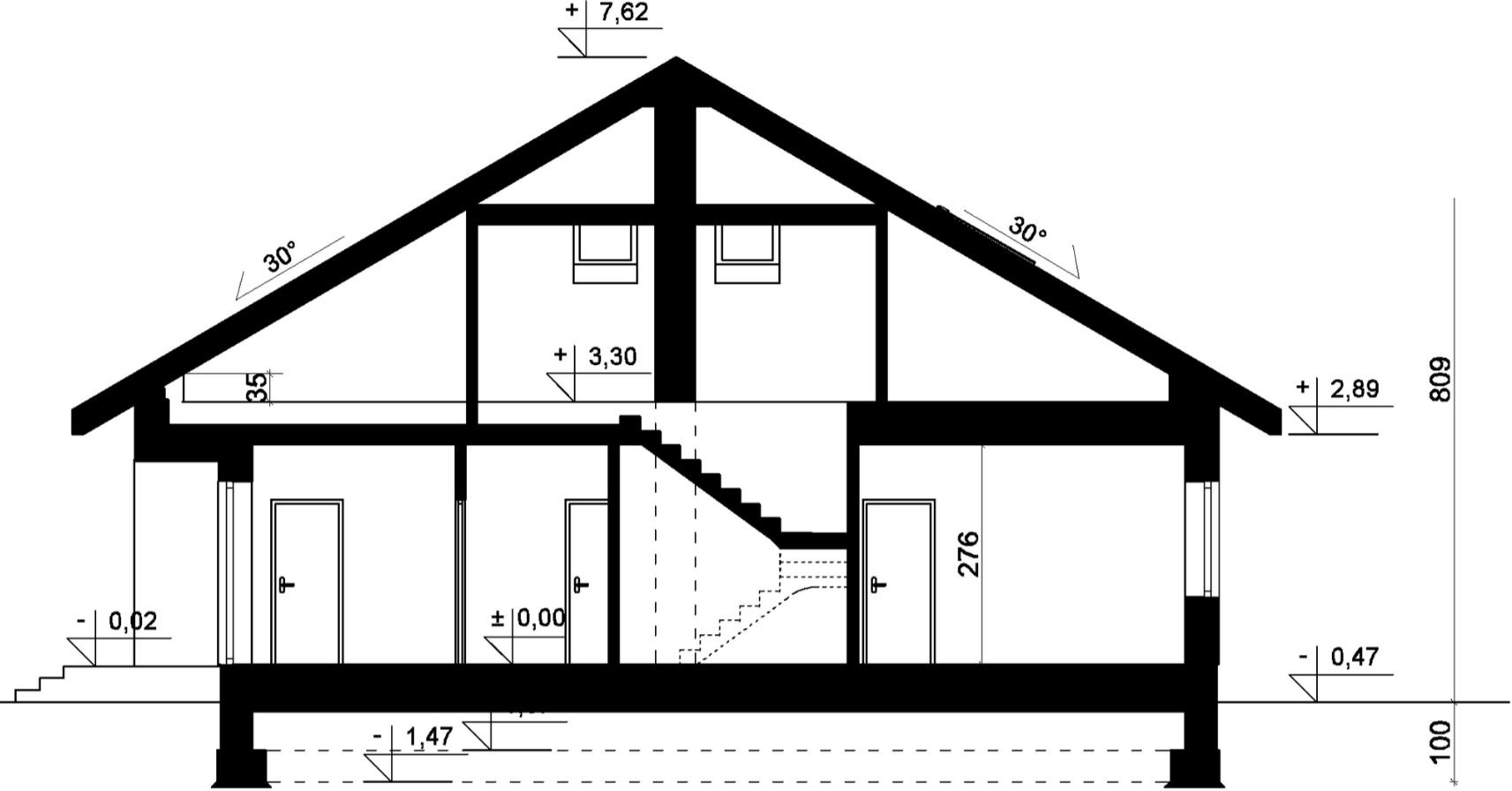 Ściany: zewnętrzne dwuwarstwowe z pustaków gazobetonowych grub. 24 cm. Ocieplenie: styropian grub. 18 cm. Strop: Teriva - ścianka kolankowa: 0,35 cm. Dach: drewniany, czterospadowy o spadku 30°, pokryty dachówką. Kocioł: gazowy. Ogrzewanie podłogowe: zastosowano w kuchni, jadalni, salonie i łazienkach. Wentylacja: mechaniczna.