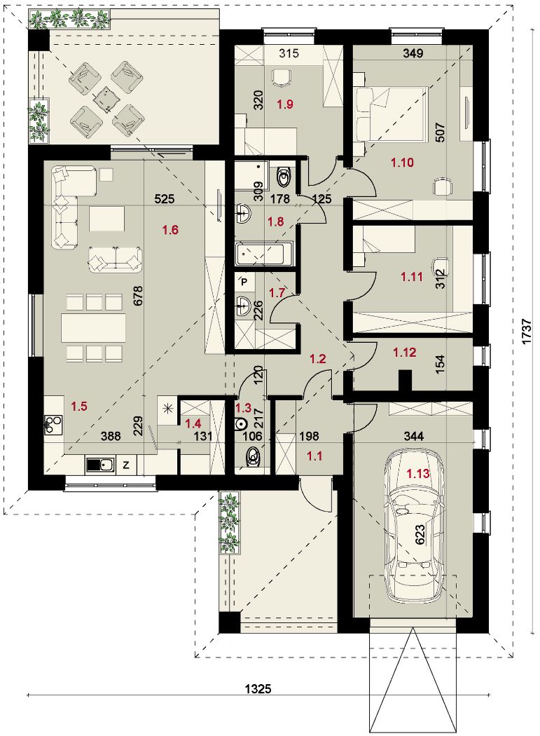Graficzne opracowanie rzutów poglądowych widocznych na karcie projektu zostało wykonane przez Extradom.pl. Prezentowane przez Extradom.pl wizualizacje wykonane zostały przez autora projektu i należy poczytywać je jedynie za przykład i propozycję wykończenia, wizję architektoniczną autora projektu. Ostateczne wykończenie budynku może nastąpić na wiele sposobów. Szczegółowe rozwiązania zastosowane w oferowanej dokumentacji - w tym również ilość, lokalizacje i wygląd okien, drzwi, kominów - mogą w niewielkim stopniu różnić się od prezentowanej wizualizacji budynku.