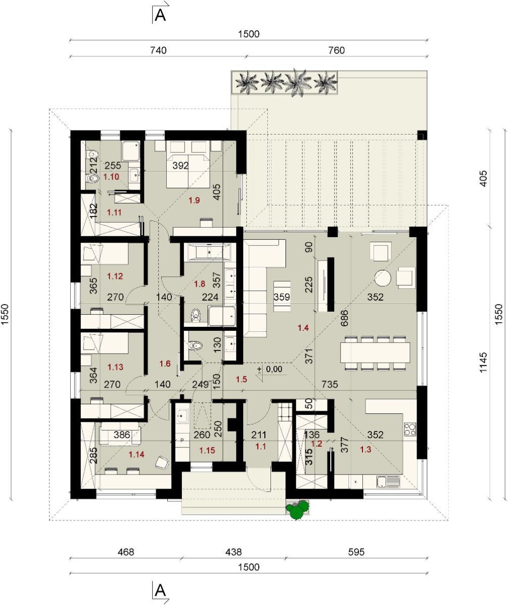 Graficzne opracowanie rzutów poglądowych widocznych na karcie projektu zostało wykonane przez Extradom.pl. Prezentowane przez Extradom.pl wizualizacje wykonane zostały przez autora projektu i należy poczytywać je jedynie za przykład i propozycję wykończenia, wizję architektoniczną autora projektu. Ostateczne wykończenie budynku może nastąpić na wiele sposobów. Szczegółowe rozwiązania zastosowane w oferowanej dokumentacji - w tym również ilość, lokalizacje i wygląd okien, drzwi, kominów - mogą w niewielkim stopniu różnić się od prezentowanej wizualizacji budynku.