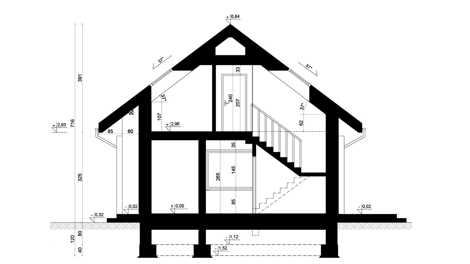 Ściany: zewnętrzne dwuwarstwowe z pustaków ceramicznych grubości 25 cm. Ocieplenie: styropian grubości 20 cm. Strop: monolityczny - ścianka kolankowa: 107 cm. Dach: drewniany, dwuspadowy o spadku 37°, pokryty dachówką. Kocioł: gazowy. Ogrzewanie podłogowe: zastosowano w kuchni, jadalni, salonie i łazienkach. Wentylacja: mechaniczna.