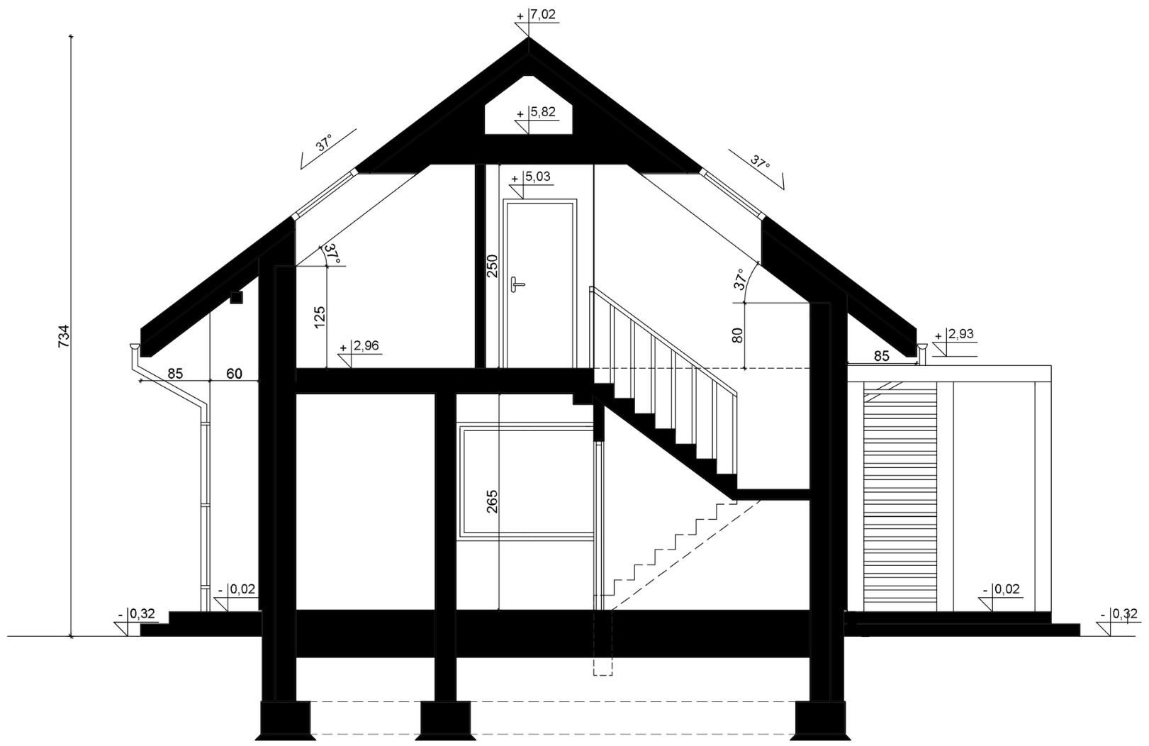 Ściany: zewnętrzne dwuwarstwowe z pustaków ceramicznych grubości 25 cm. Ocieplenie: styropian grubości 20 cm. Strop: monolityczny - ścianka kolankowa: 107 cm. Dach: drewniany, dwuspadowy o spadku 37°, pokryty dachówką. Kocioł: gazowy. Ogrzewanie podłogowe: zastosowano w kuchni, jadalni, salonie i łazienkach. Wentylacja: mechaniczna.