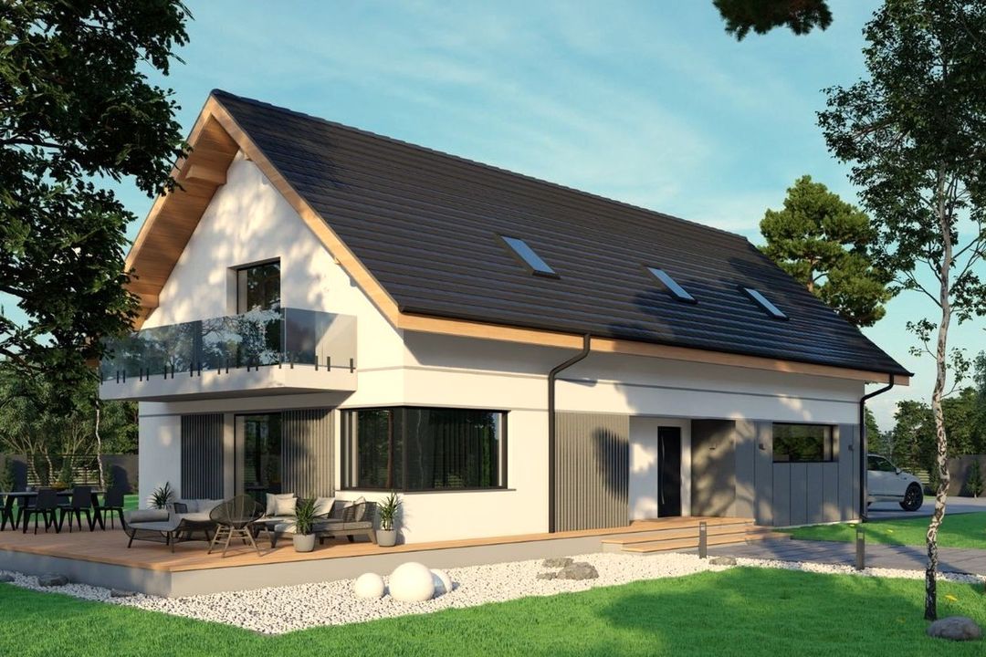 Graficzne opracowanie rzutów poglądowych widocznych na karcie projektu zostało wykonane przez Extradom.pl. Prezentowane przez Extradom.pl wizualizacje wykonane zostały przez autora projektu i należy poczytywać je jedynie za przykład i propozycję wykończenia, wizję architektoniczną autora projektu. Ostateczne wykończenie budynku może nastąpić na wiele sposobów. Szczegółowe rozwiązania zastosowane w oferowanej dokumentacji - w tym również ilość, lokalizacje i wygląd okien, drzwi, kominów - mogą w niewielkim stopniu różnić się od prezentowanej wizualizacji budynku.