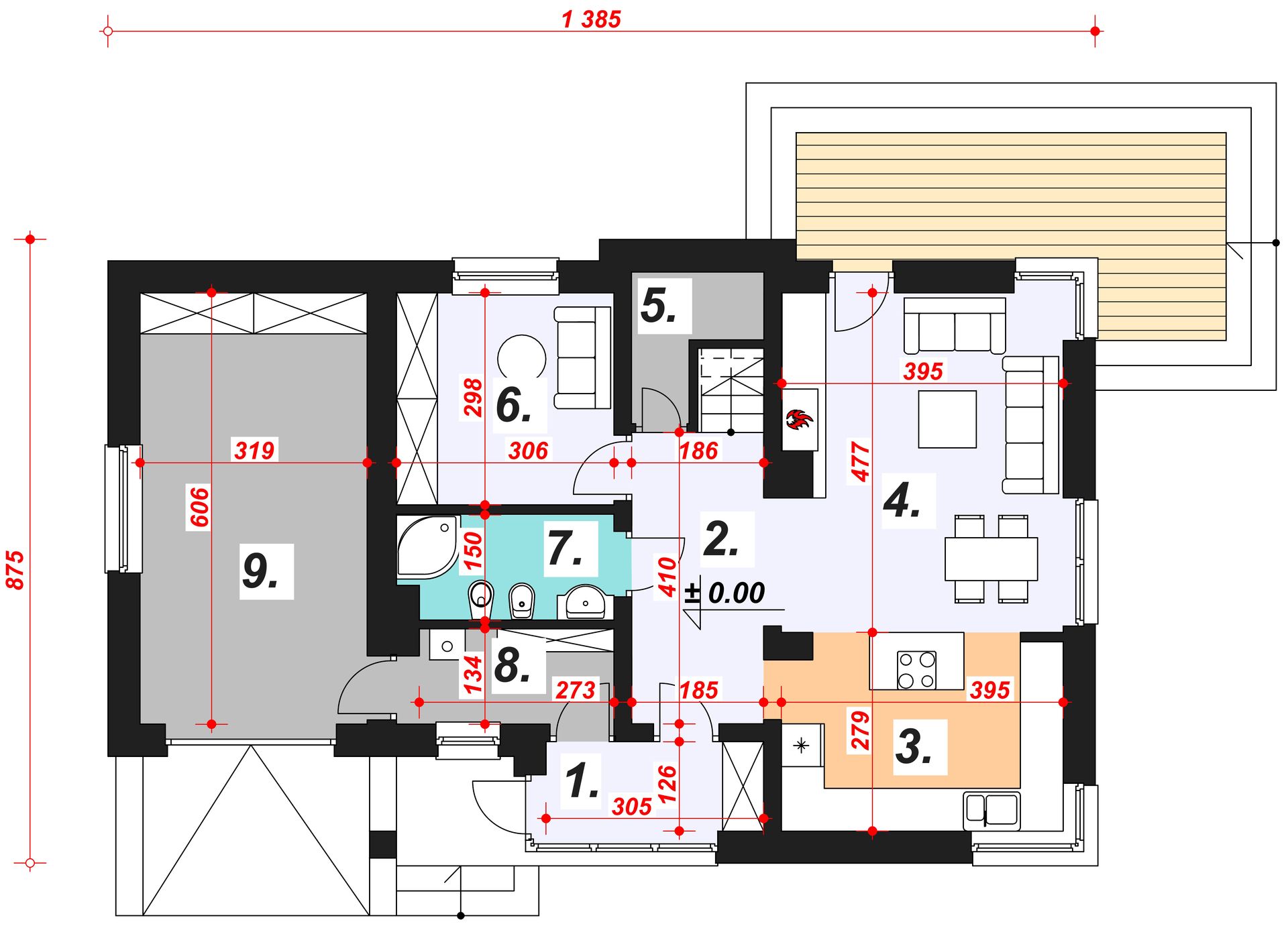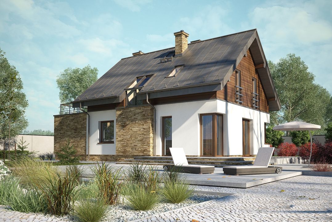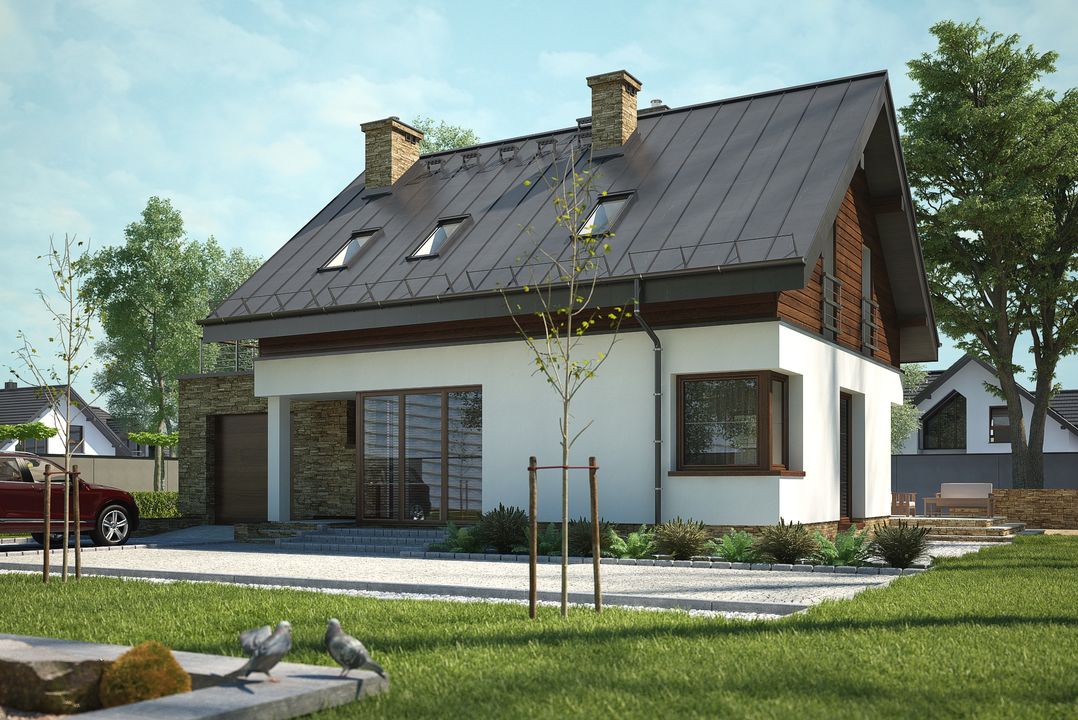 Graficzne opracowanie rzutów poglądowych widocznych na karcie projektu zostało wykonane przez Extradom.pl. Prezentowane przez Extradom.pl wizualizacje wykonane zostały przez autora projektu i należy poczytywać je jedynie za przykład i propozycję wykończenia, wizję architektoniczną autora projektu. Ostateczne wykończenie budynku może nastąpić na wiele sposobów. Szczegółowe rozwiązania zastosowane w oferowanej dokumentacji - w tym również ilość, lokalizacje i wygląd okien, drzwi, kominów - mogą w niewielkim stopniu różnić się od prezentowanej wizualizacji budynku.
