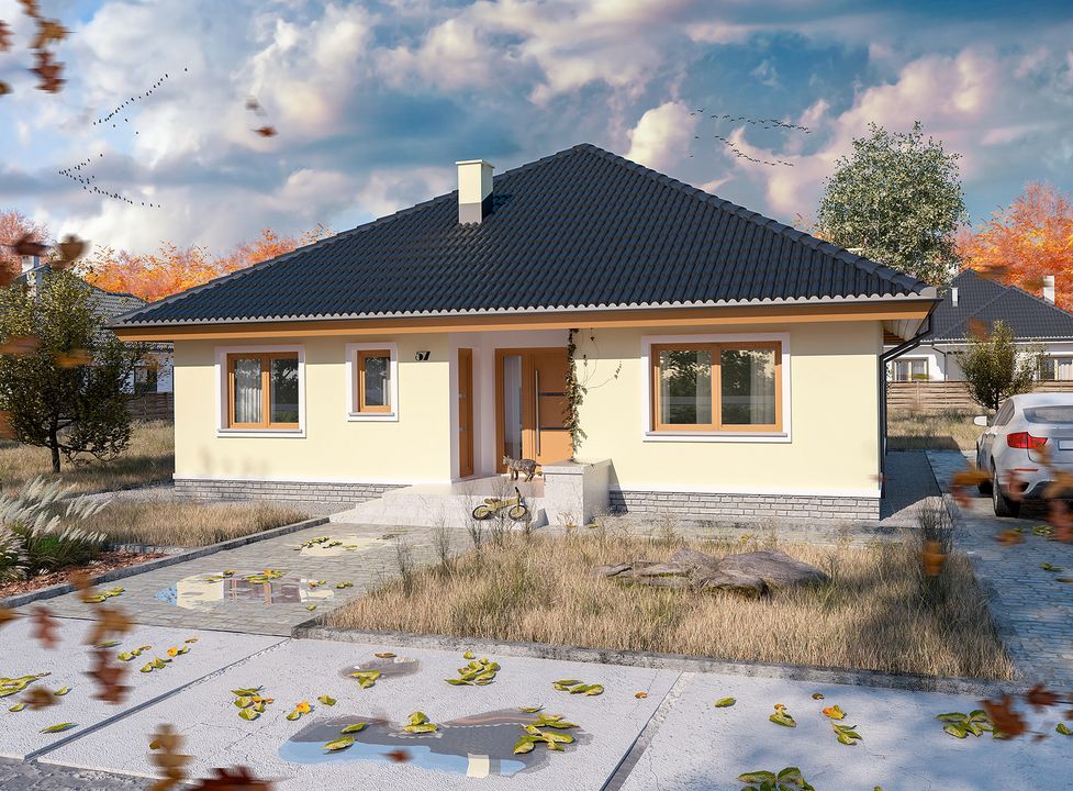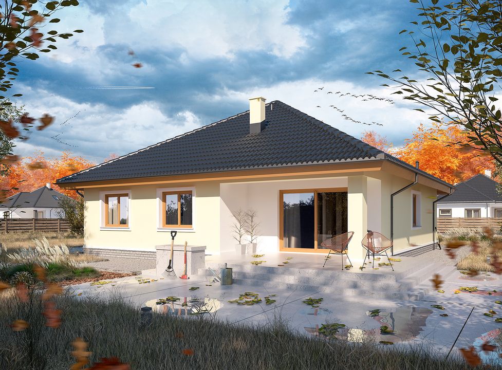 Od początku chcieliśmy, aby wszystkie pomieszczenia w naszym nowym domu znajdowały się na jednej kondygnacji. Przy wyborze idealnego projektu dużą uwagę zwracaliśmy również na metraż. Nie potrzebowaliśmy bardzo dużego, ale jednocześnie interesowała nas w pełni komfortowa przestrzeń. Oprócz tego, chcieliśmy aby realizacja nie pochłonęła wielu środków finansowych. Wśród propozycji budynków parterowych natrafiliśmy na projekt Serafin paliwo stałe WOE1060. Powierzchnia ok. 115 m² w całości spełniała potrzeby naszej rodziny, a dodatkowo wydał się nam tani w budowie. Jestem zadowolony z przebiegu inwestycji. Prace postępowały sprawnie i zgodnie z wcześniej założonym planem. Wszystko udało nam się zakończyć w naprawdę krótkim czasie - do nowego, wykończonego domu wprowadziliśmy się już po zaledwie 9 miesiacach od rozpoczęcia budowy. Do postawienia fundamentów użyliśmy tradycyjnych bloczków betonowych. Ściany zostały wymurowane z bloczków z betonu komórkowego marki Solbet. Postanowiliśmy zmienić sugerowaną w projekcie metodę wykonania więźby oraz stropu i w naszym przypadku tworzy je jedna konstrukcja na gotowych wiązarach kratowych. Dach pokryliśmy blachodachówką. Przy użyciu powyższych materiałów, udało nam się zmieścić w kosztach oszacowanych przez architekta. Nasza realizacja projektu domu Serafin paliwo stałe WOE1060 na etapie stanu surowego zamkniętego wyniosła ok. 180 tys. zł. Projekt domu Serafin paliwo stałe WOE1060 został stworzony z myślą o ogrzewaniu węglowym, aczkolwiek my zdecydowaliśmy się na zastosowanie pompy ciepła. Tym samym instalacje grzewcze uległy zmianie, a dodatkowo zwiększyliśmy obszar tzw. „podłogówki”. Z racji zastosowanego systemu grzewczego, nie potrzebowaliśmy aż tak dużej kotłowni. Kosztem jej części postanowiliśmy więc powiększyć kuchnię, przesuwając ściankę między nimi o 0,5 m. Wejście do kotłowni wykonaliśmy od strony wiatrołapu, a jej powierzchnię wykorzystaliśmy ponadto na zrobienie pralni i spiżarni. Stwierdziliśmy, iż przy małych dzieciach trudno będzie nam utrzymać zawsze idealny porządek w łazience, dlatego chcieliśmy uzyskać osobną toaletę dla gości. Powierzchnię oryginalnie przewidzianej pralni przyłączyliśmy do głównej łazienki, a następnie kosztem jej części wygospodarowaliśmy osobne WC z wejściem od strony głównego hallu. Dzięki temu łatwo dostać się do niego z salonu i nie trzeba przechodzić przez strefę sypialnianą. Oprócz tego, lekko powiększyliśmy hall kosztem części garderoby, a w niej umieściliśmy wysuwane schody na strych. Z boku budynku wykonaliśmy zadaszoną wiatę na samochód.Wybór projektu domu parterowego Serafin paliwo stałe WOE1060 okazał się dla nas bardzo trafioną decyzją. Od początku bardzo przypadł nam do gustu, a drobne modyfikacje pozwoliły w całości dopasować go do wszystkich naszych oczekiwań. Rozkład wnętrza jest funkcjonalny, a widoczny podział mieszkania na strefę dzienną i nocną doskonale się sprawdza. Pozdrawiam.