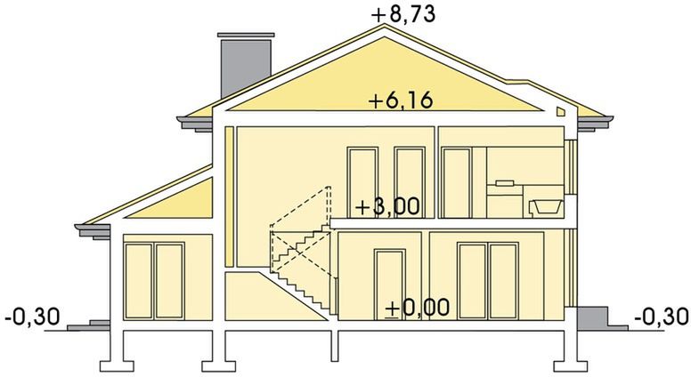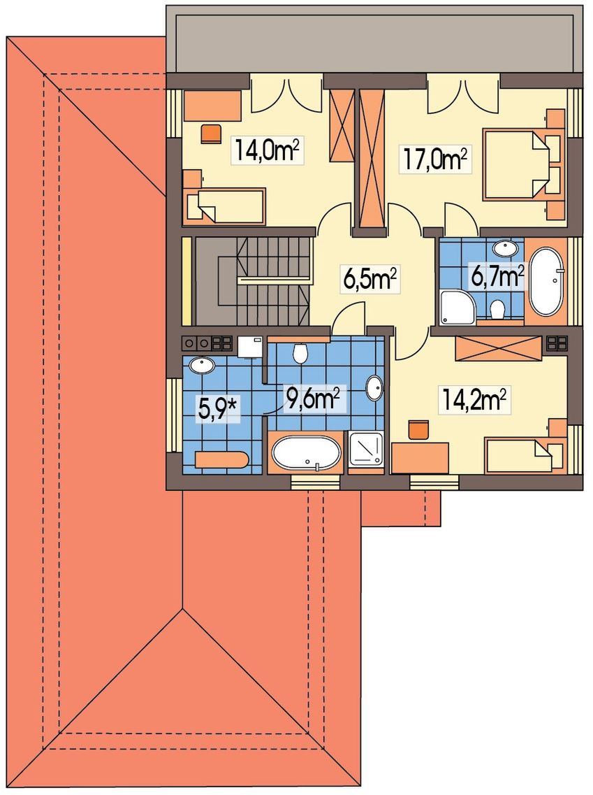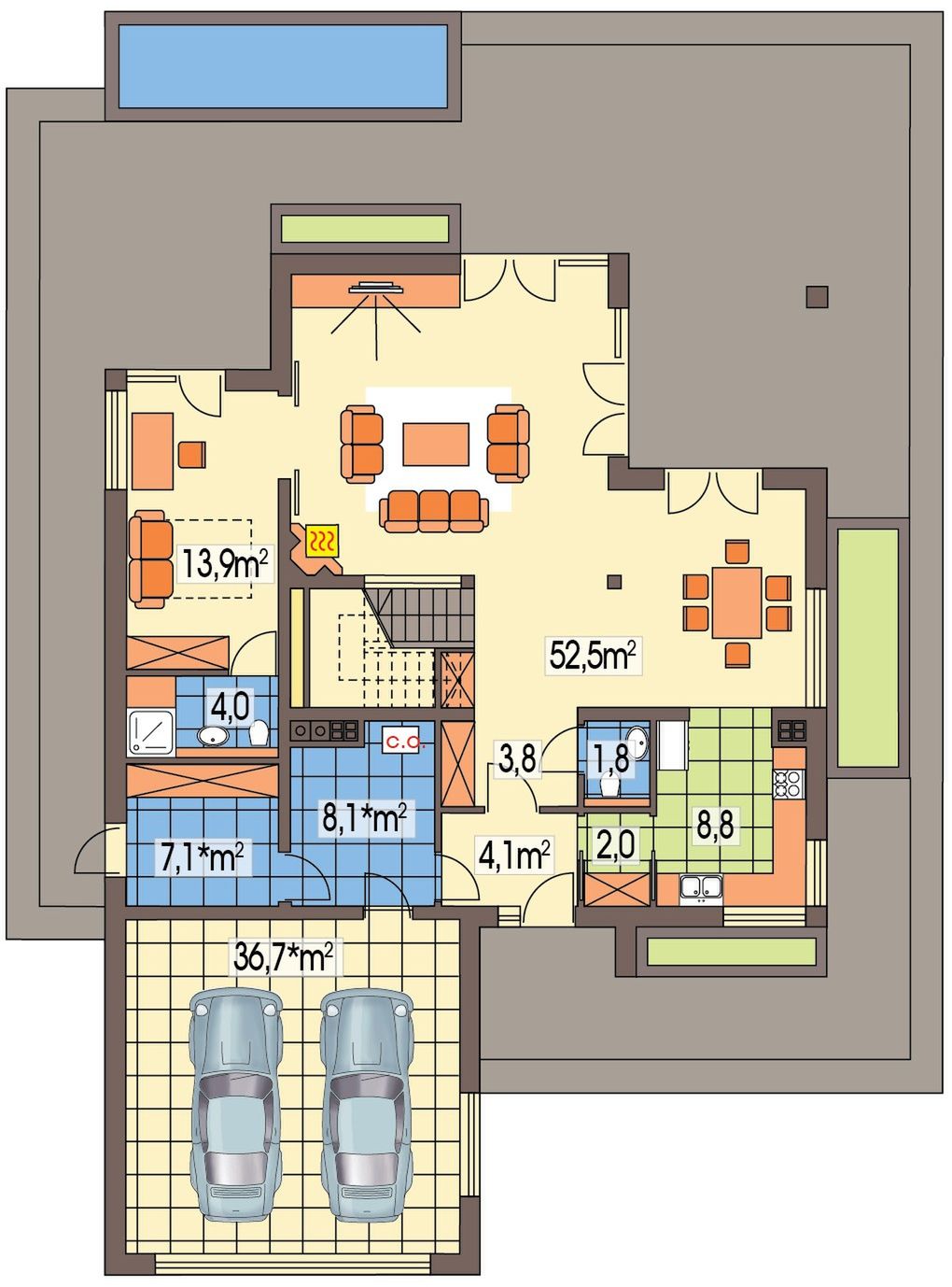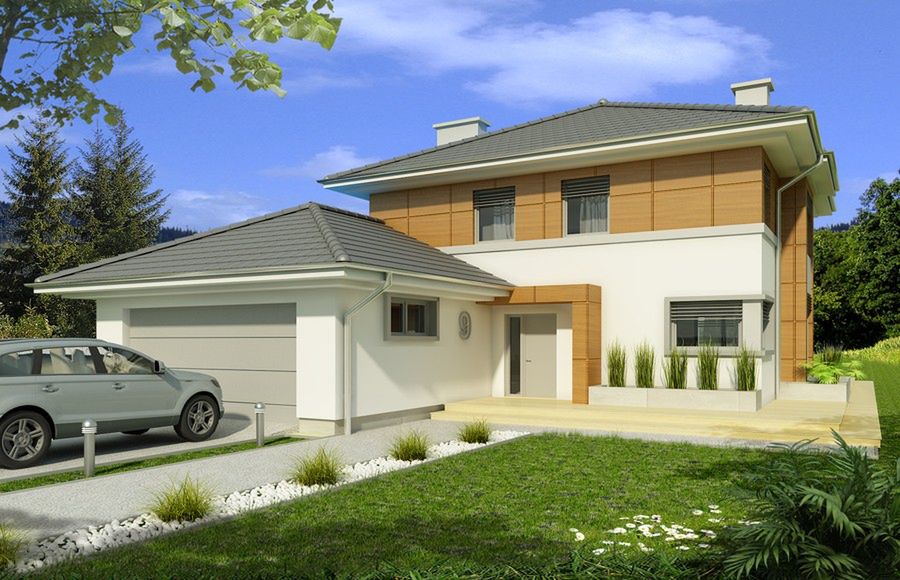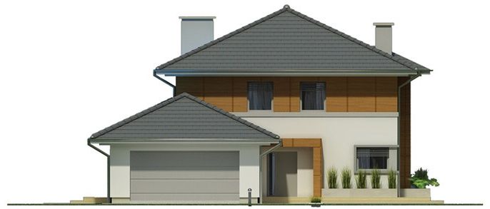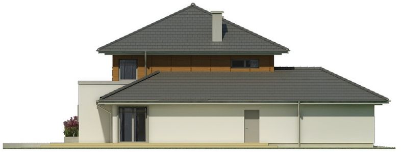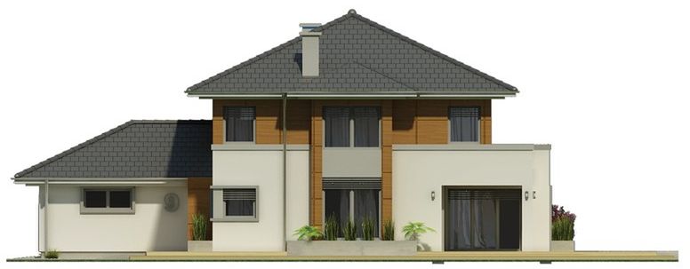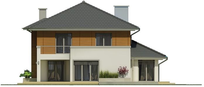 Graficzne opracowanie rzutów poglądowych widocznych na karcie projektu zostało wykonane przez Extradom.pl. Prezentowane przez Extradom.pl wizualizacje wykonane zostały przez autora projektu i należy poczytywać je jedynie za przykład i propozycję wykończenia, wizję architektoniczną autora projektu. Ostateczne wykończenie budynku może nastąpić na wiele sposobów. Szczegółowe rozwiązania zastosowane w oferowanej dokumentacji - w tym również ilość, lokalizacje i wygląd okien, drzwi, kominów - mogą w niewielkim stopniu różnić się od prezentowanej wizualizacji budynku.