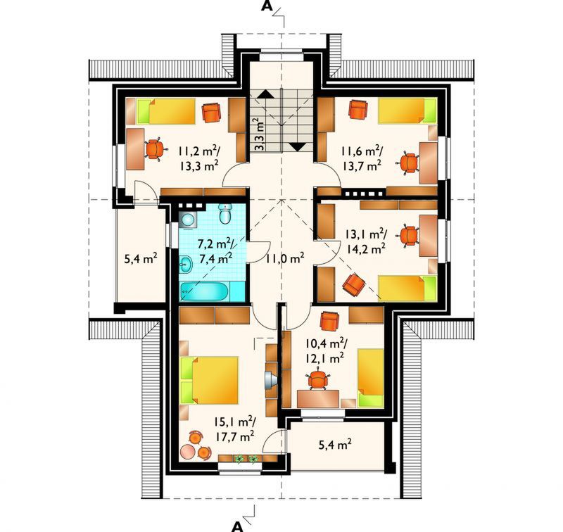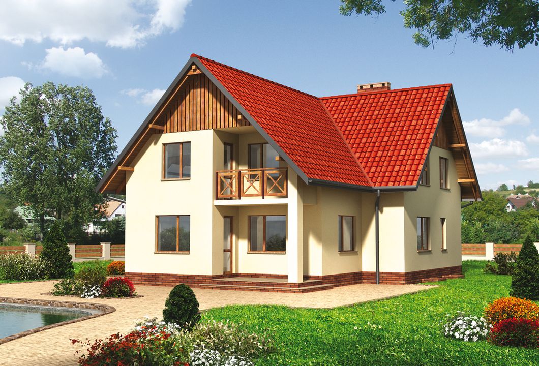 Graficzne opracowanie rzutów poglądowych widocznych na karcie projektu zostało wykonane przez Extradom.pl. Prezentowane przez Extradom.pl wizualizacje wykonane zostały przez autora projektu i należy poczytywać je jedynie za przykład i propozycję wykończenia, wizję architektoniczną autora projektu. Ostateczne wykończenie budynku może nastąpić na wiele sposobów. Szczegółowe rozwiązania zastosowane w oferowanej dokumentacji - w tym również ilość, lokalizacje i wygląd okien, drzwi, kominów - mogą w niewielkim stopniu różnić się od prezentowanej wizualizacji budynku.