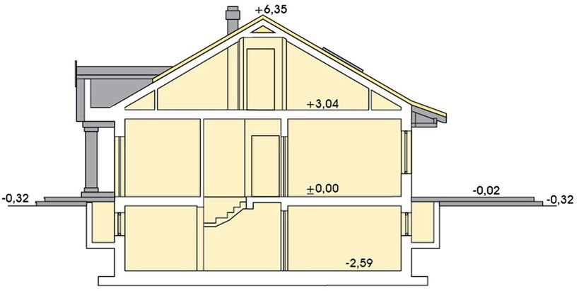Strop: gęstożebrowy Teriva lub strop drewniany. Ściany zewnętrzne: gazobeton. Pokrycie dachowe: dachówka. Okna połaciowe: Velux. Fundamentowanie: Ławy fundamentowe.