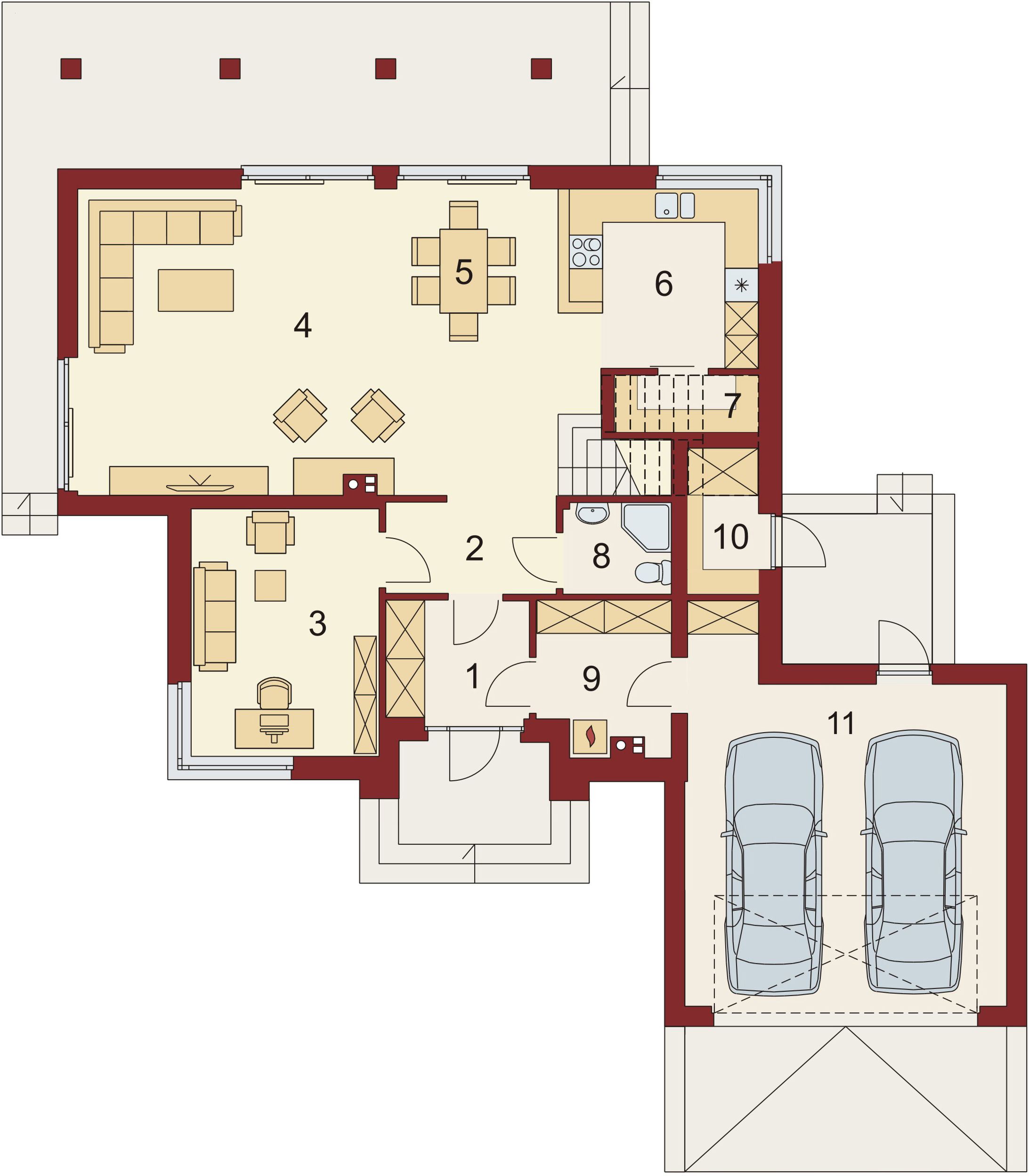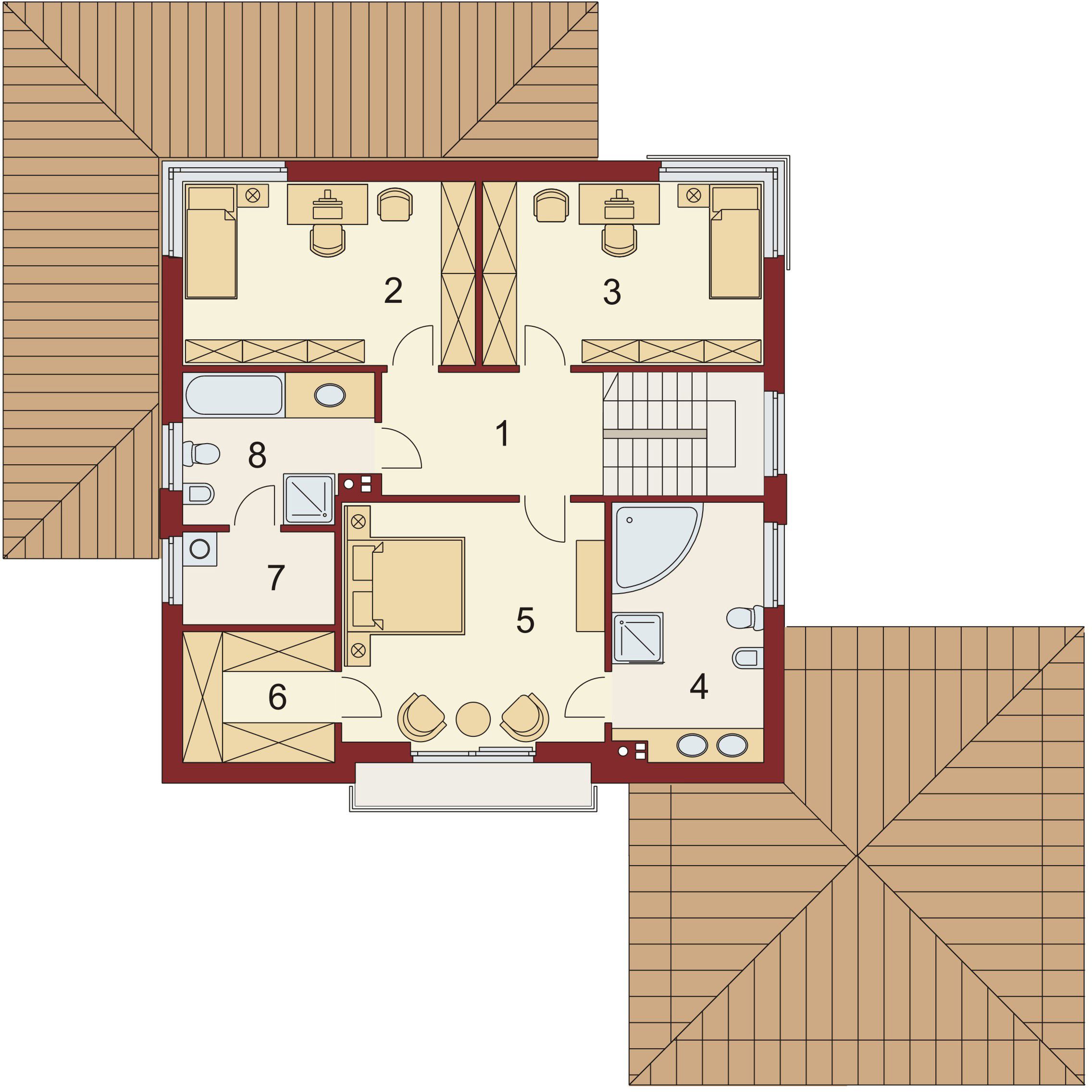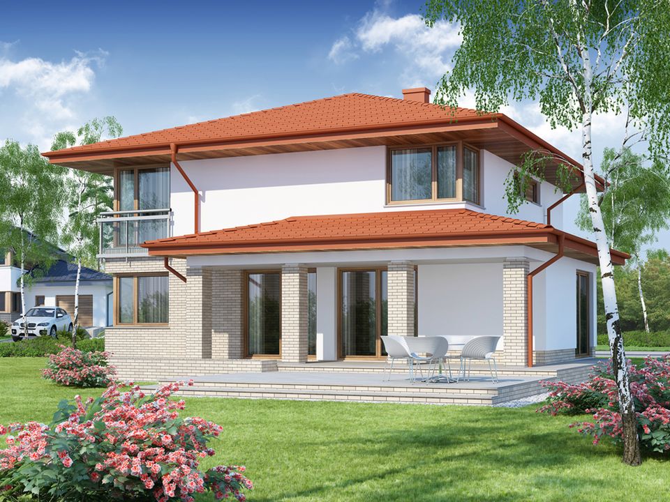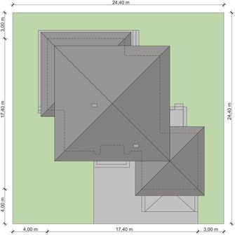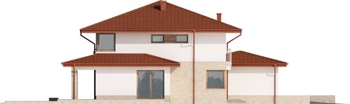 Graficzne opracowanie rzutów poglądowych widocznych na karcie projektu zostało wykonane przez Extradom.pl. Prezentowane przez Extradom.pl wizualizacje wykonane zostały przez autora projektu i należy poczytywać je jedynie za przykład i propozycję wykończenia, wizję architektoniczną autora projektu. Ostateczne wykończenie budynku może nastąpić na wiele sposobów. Szczegółowe rozwiązania zastosowane w oferowanej dokumentacji - w tym również ilość, lokalizacje i wygląd okien, drzwi, kominów - mogą w niewielkim stopniu różnić się od prezentowanej wizualizacji budynku.