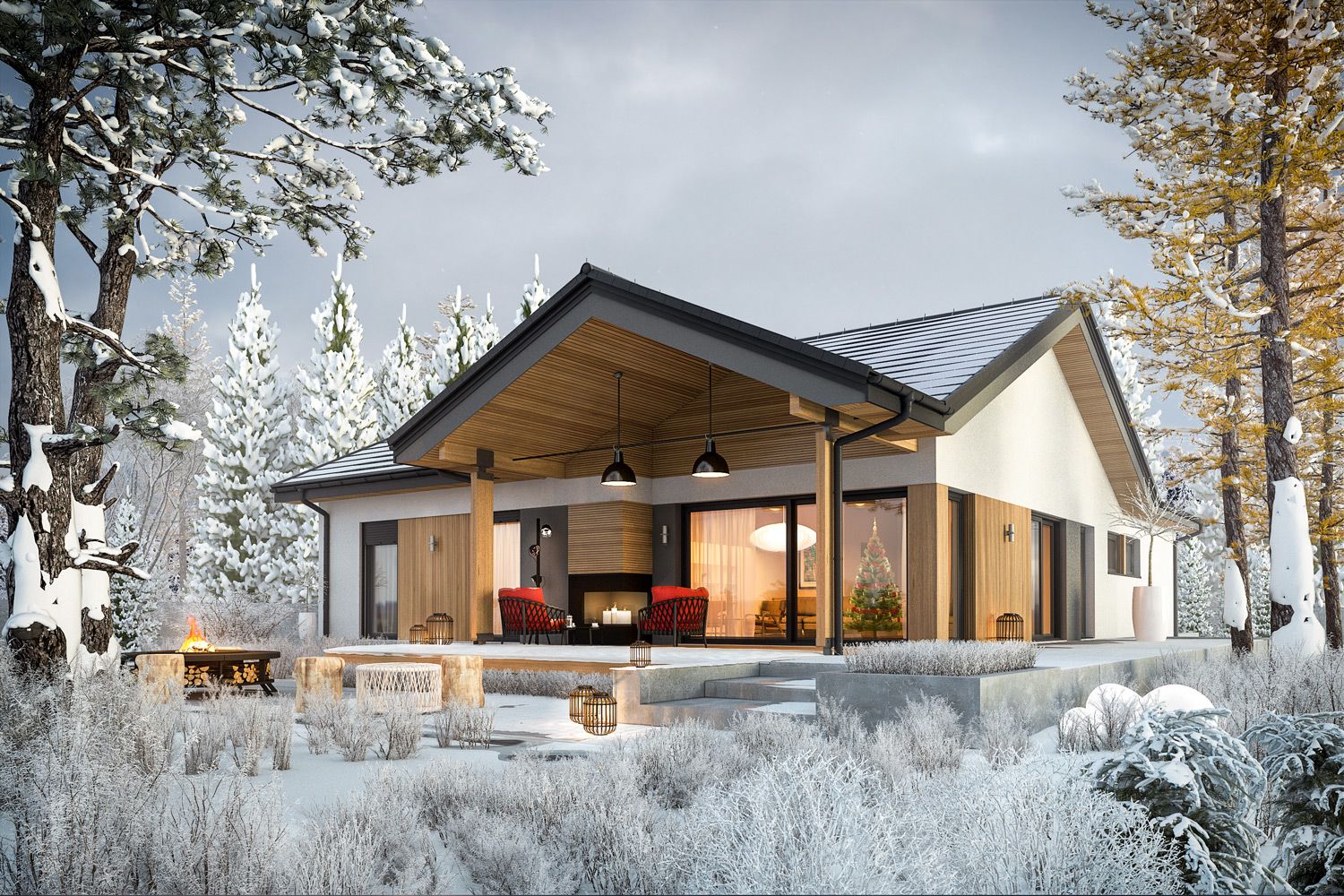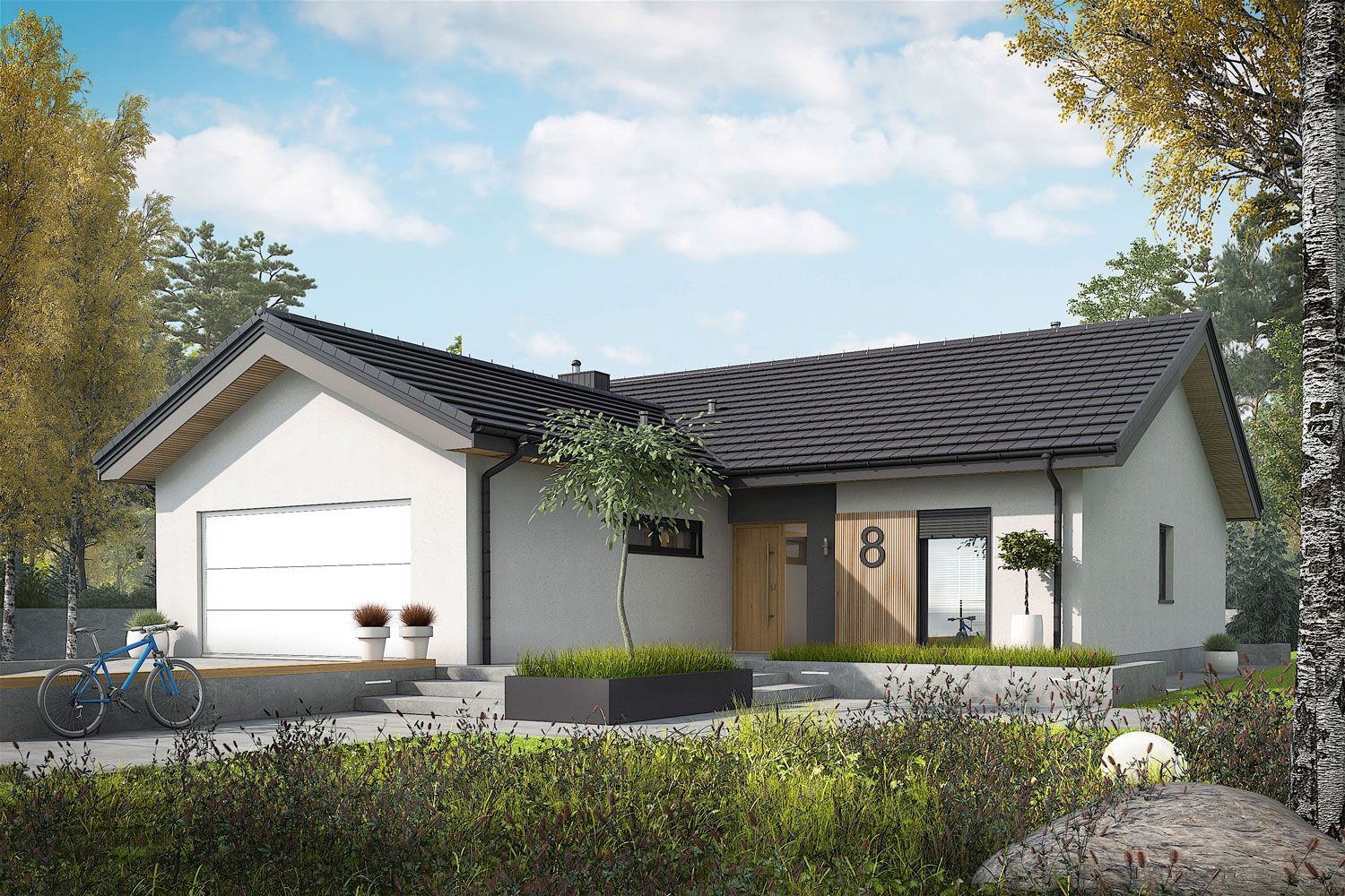 Ściany zewnętrzne: murowane, dwuwarstwowe, beton komórkowy firmy H+H 24 cm, ocieplenie styropian Termo Organika 20 cm. Ściany wewnętrzne: nośne i działowe murowane, beton komórkowy firmy H+H 24 cm i 12 cm. Strop: gęstożebrowy Teriva, ocieplenie wełna mineralna Isover 30 cm. Dach: konstrukcja drewniana, dachówka ceramiczna płaska Bergamo firmy Röben, więźba dachowa dostępna również w systemie prefabrykacji drewnianej. Ogrzewanie: kocioł gazowy kondensacyjny firmy Viessmann, rozprowadzenie ciepła: grzejniki firmy Purmo. Wentylacja: grawitacyjna. OZE: kolektory słoneczne. Elewacje: tynk cienkowarstwowy mineralny w kolorze białym TO-PA001 z palety firmy Termo Organika, okładzina drewniana. Stolarka: drewniana, PVC lub aluminiowa, rolety zewnętrzne w systemie CleverBox firmy BeClever, drzwi wejściowe i brama garażowa firmy Hörmann. Otoczenie: kostka betonowa i płyty tarasowe firmy Libet, system tarasowy ProDeck - deska kompozytowa Terra w kolorze orzech.