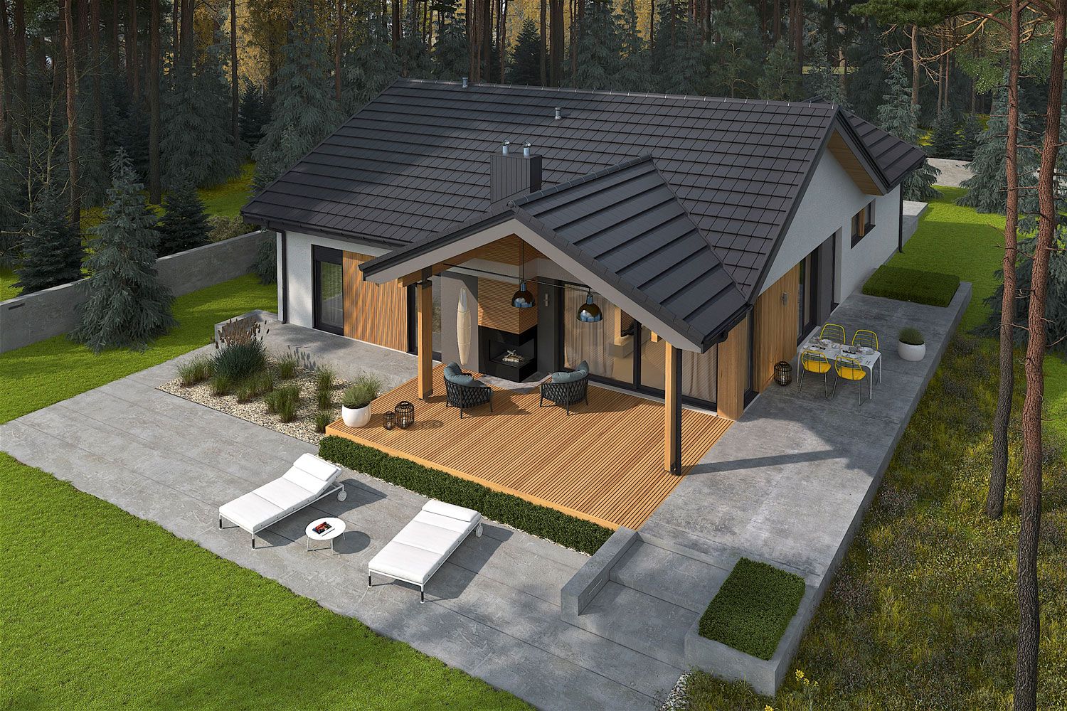Graficzne opracowanie rzutów poglądowych widocznych na karcie projektu zostało wykonane przez Extradom.pl. Prezentowane przez Extradom.pl wizualizacje wykonane zostały przez autora projektu i należy poczytywać je jedynie za przykład i propozycję wykończenia, wizję architektoniczną autora projektu. Ostateczne wykończenie budynku może nastąpić na wiele sposobów. Szczegółowe rozwiązania zastosowane w oferowanej dokumentacji - w tym również ilość, lokalizacje i wygląd okien, drzwi, kominów - mogą w niewielkim stopniu różnić się od prezentowanej wizualizacji budynku.