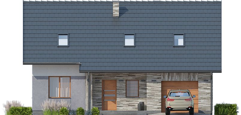 Simplex II G1 charakteryzuje się prostą, zwartą bryłą przykrytą klasycznym, dwuspadowym dachem, co jest gwarancją niskich kosztów budowy i późniejszej eksploatacji. Tradycyjny styl domu podkreśla wysunięty do przodu garaż, który tworzy praktyczne zadaszenie nad strefą wejściową. Całość prezentuje się spójnie i ponadczasowo, doskonale wpisując się w każde otoczenie.