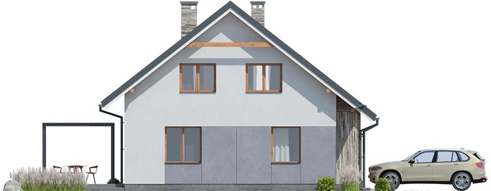 Graficzne opracowanie rzutów poglądowych widocznych na karcie projektu zostało wykonane przez Extradom.pl. Prezentowane przez Extradom.pl wizualizacje wykonane zostały przez autora projektu i należy poczytywać je jedynie za przykład i propozycję wykończenia, wizję architektoniczną autora projektu. Ostateczne wykończenie budynku może nastąpić na wiele sposobów. Szczegółowe rozwiązania zastosowane w oferowanej dokumentacji - w tym również ilość, lokalizacje i wygląd okien, drzwi, kominów - mogą w niewielkim stopniu różnić się od prezentowanej wizualizacji budynku.
