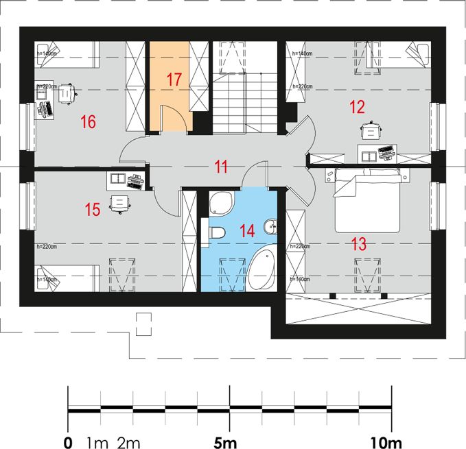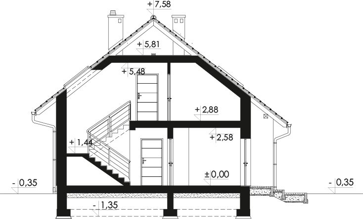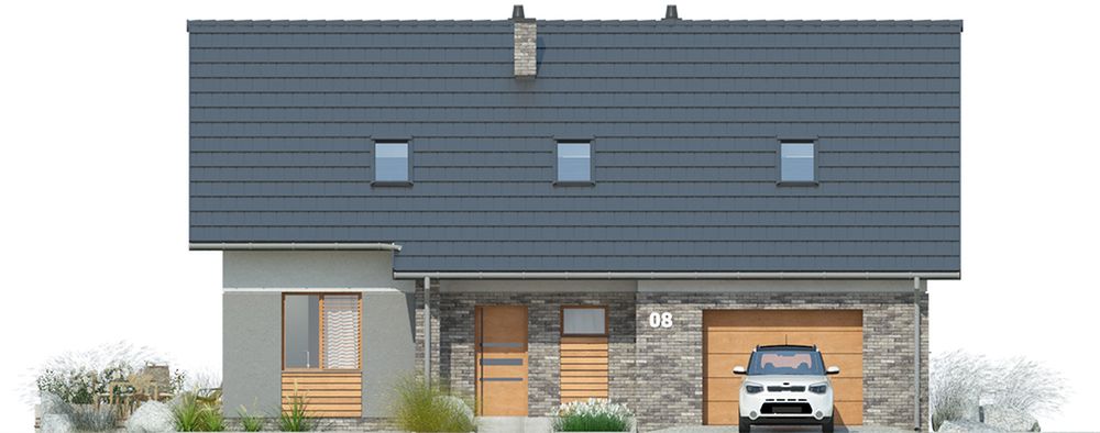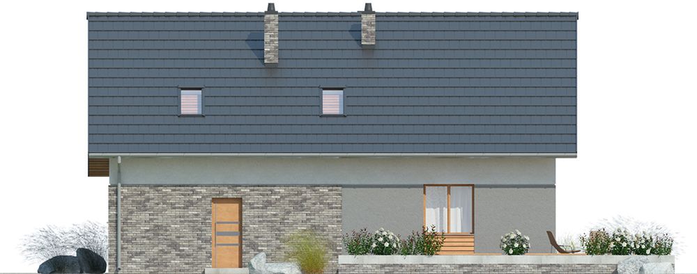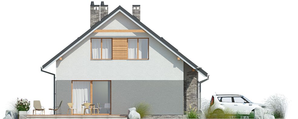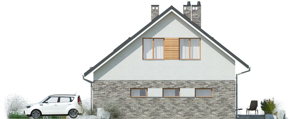Graficzne opracowanie rzutów poglądowych widocznych na karcie projektu zostało wykonane przez Extradom.pl. Prezentowane przez Extradom.pl wizualizacje wykonane zostały przez autora projektu i należy poczytywać je jedynie za przykład i propozycję wykończenia, wizję architektoniczną autora projektu. Ostateczne wykończenie budynku może nastąpić na wiele sposobów. Szczegółowe rozwiązania zastosowane w oferowanej dokumentacji - w tym również ilość, lokalizacje i wygląd okien, drzwi, kominów - mogą w niewielkim stopniu różnić się od prezentowanej wizualizacji budynku.