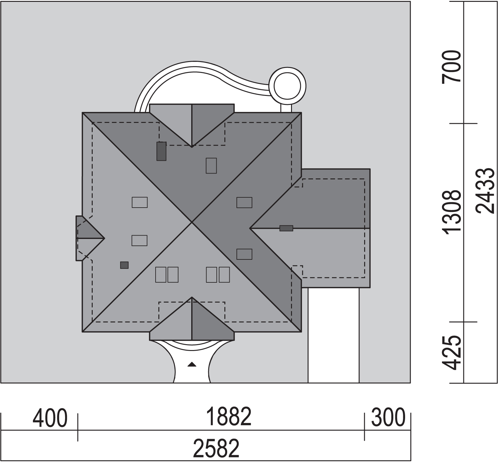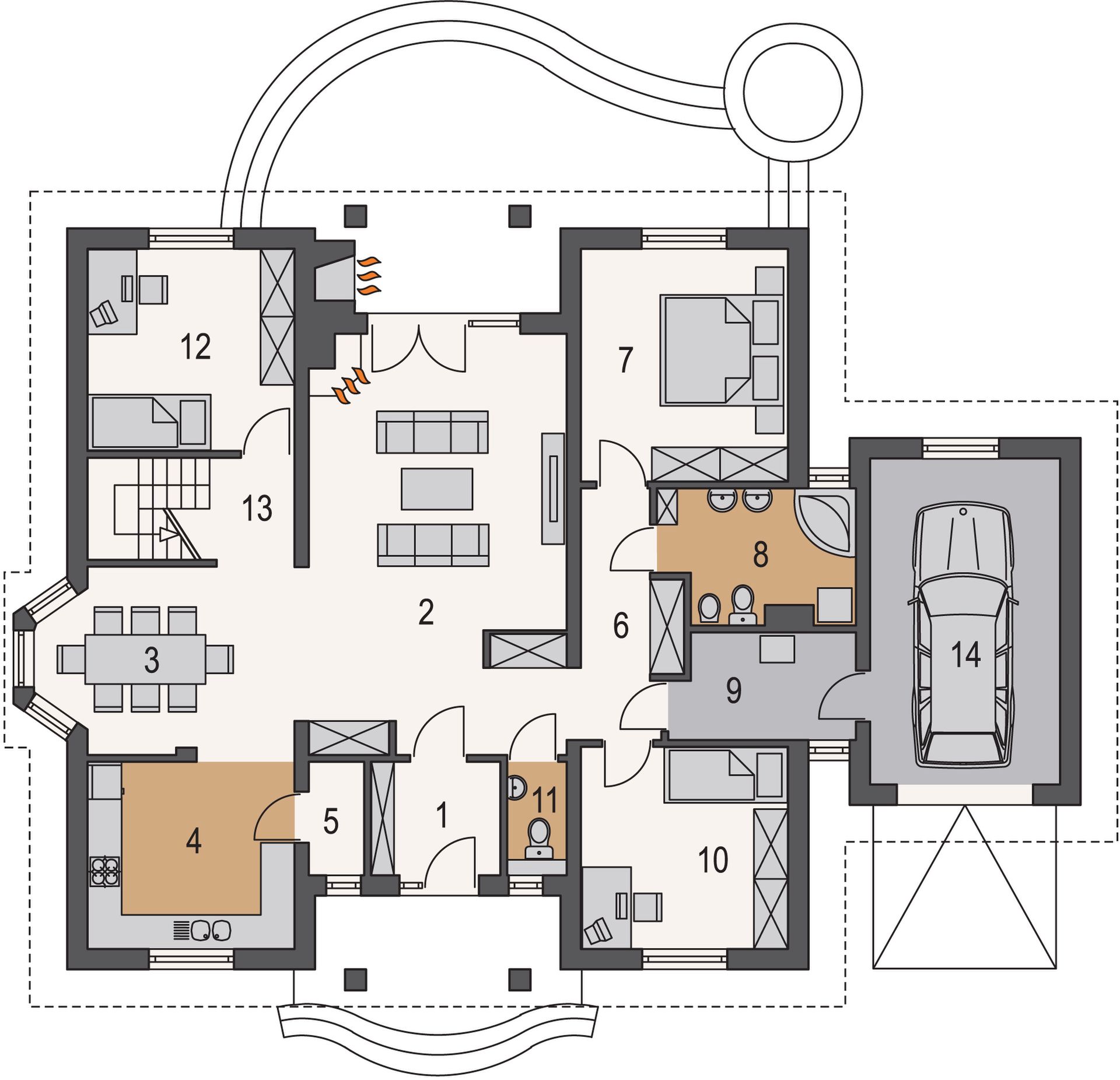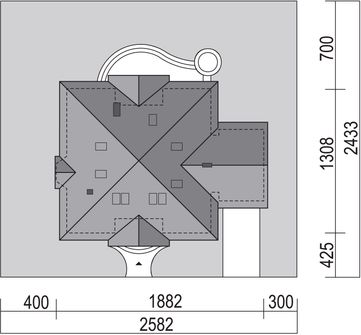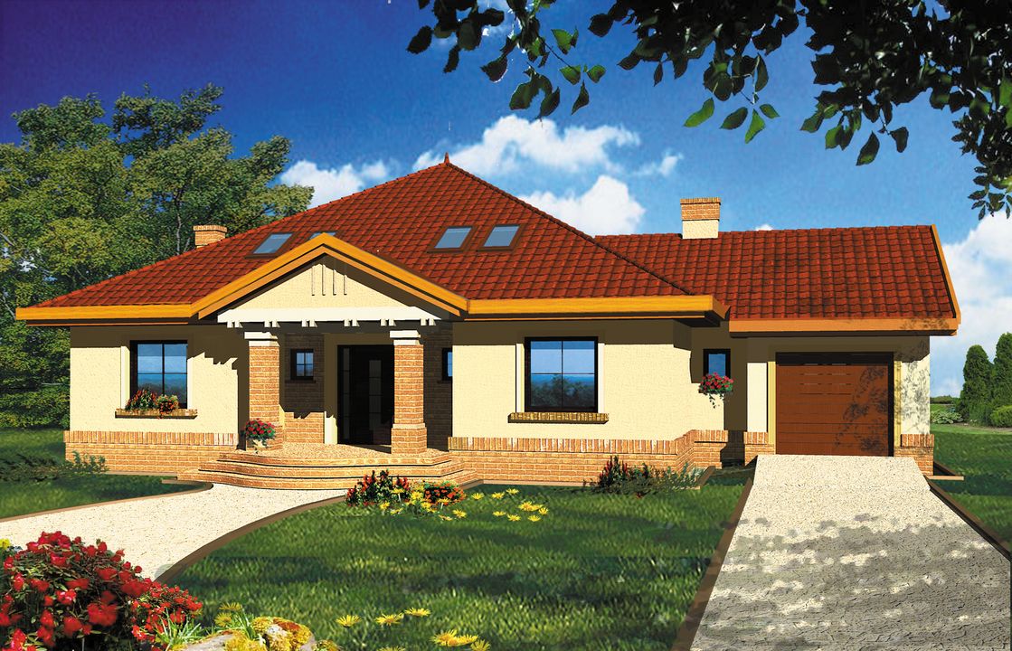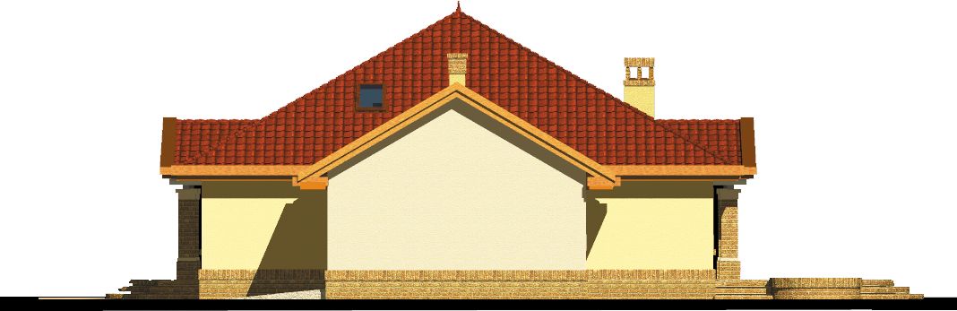 Graficzne opracowanie rzutów poglądowych widocznych na karcie projektu zostało wykonane przez Extradom.pl. Prezentowane przez Extradom.pl wizualizacje wykonane zostały przez autora projektu i należy poczytywać je jedynie za przykład i propozycję wykończenia, wizję architektoniczną autora projektu. Ostateczne wykończenie budynku może nastąpić na wiele sposobów. Szczegółowe rozwiązania zastosowane w oferowanej dokumentacji - w tym również ilość, lokalizacje i wygląd okien, drzwi, kominów - mogą w niewielkim stopniu różnić się od prezentowanej wizualizacji budynku.