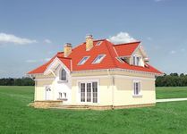 Technologia i konstrukcja: murowana – beton komórkowy. Ściany zewnętrzne: bloczki SOLBET Optimal gr. 24cm + docieplenie płyty FASROCK MAX gr. 15cm. Ściany wewnętrzne: bloczki SOLBET Optimal gr. 24cm, działowe gr. 12cm. Strop: żelbetowy. Konstrukcja dachu: drewniana, krokwiowa. Rodzaj schodów: żelbetowe. Typ ogrzewania: kocioł na gaz. Aneks na paliwo stałe: dostępny (zapytaj o cenę). Pokrycie dachu: dachówka cementowa BRAAS. Elewacja: tynki silikonowe, silikatowe oraz mineralne.