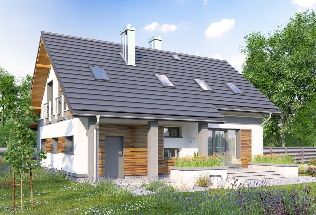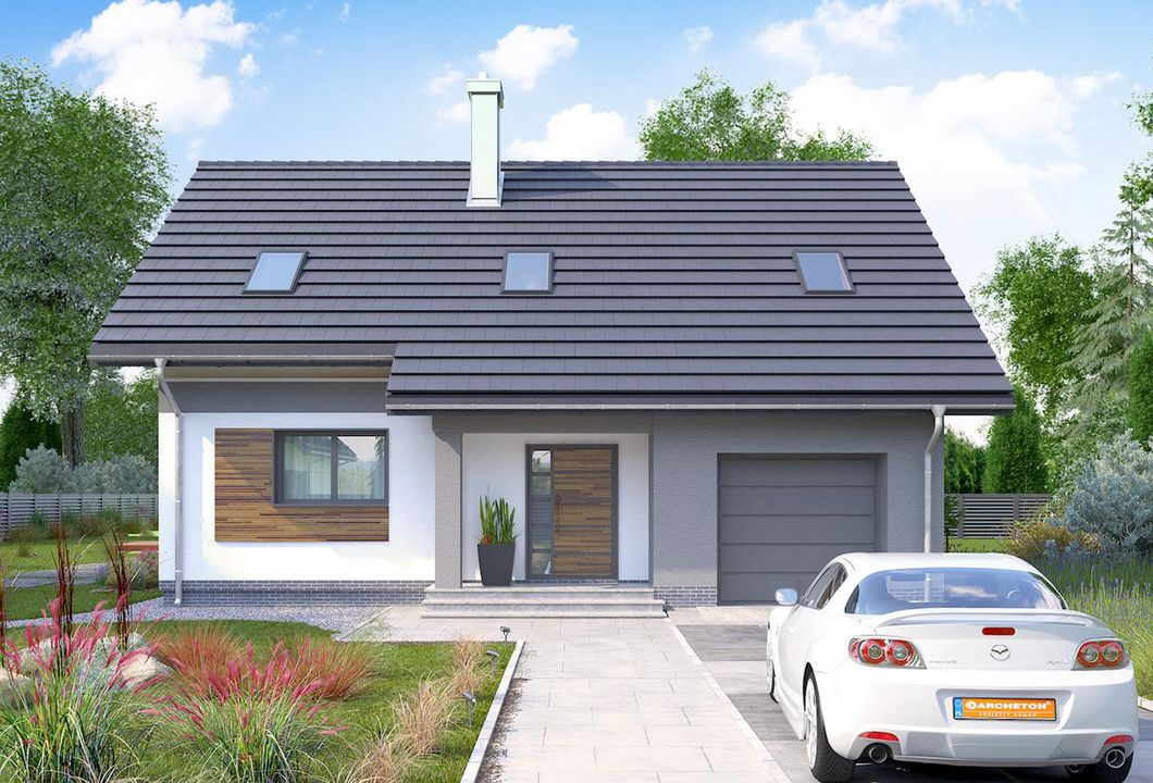 Graficzne opracowanie rzutów poglądowych widocznych na karcie projektu zostało wykonane przez Extradom.pl. Prezentowane przez Extradom.pl wizualizacje wykonane zostały przez autora projektu i należy poczytywać je jedynie za przykład i propozycję wykończenia, wizję architektoniczną autora projektu. Ostateczne wykończenie budynku może nastąpić na wiele sposobów. Szczegółowe rozwiązania zastosowane w oferowanej dokumentacji - w tym również ilość, lokalizacje i wygląd okien, drzwi, kominów - mogą w niewielkim stopniu różnić się od prezentowanej wizualizacji budynku.