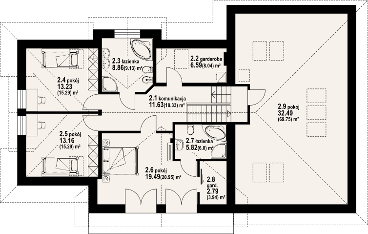 Wysokość ścianki kolankowej: 1.74 m. Strop: płyta żelbetowa. Pokrycie dachu: dachówka ceramiczna. Ściany zewnętrzne: pustaki ceramiczne + styropian. Ściany wewnętrzne: pustaki ceramiczne. Typ ogrzewania: kocioł gazowy lub kocioł na paliwo stałe. Instalacje dodatkowe: instalacja solarna. Inne: okna połaciowe Fakro.