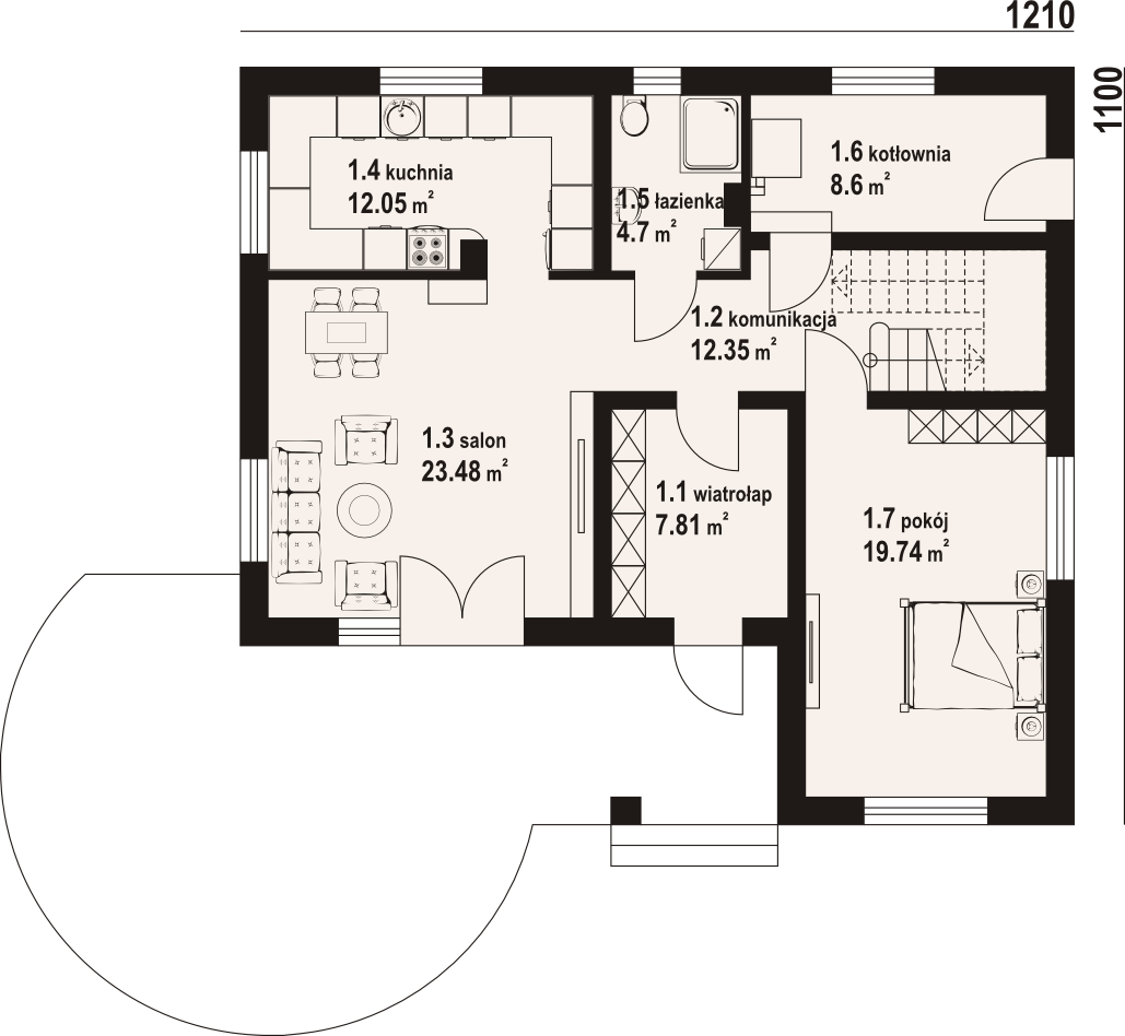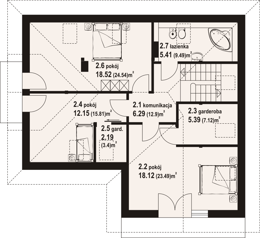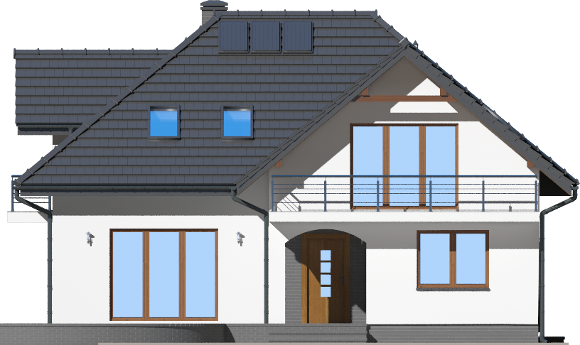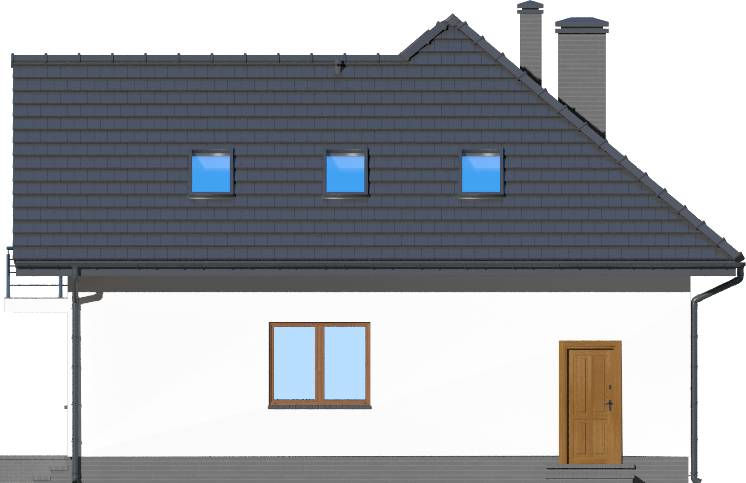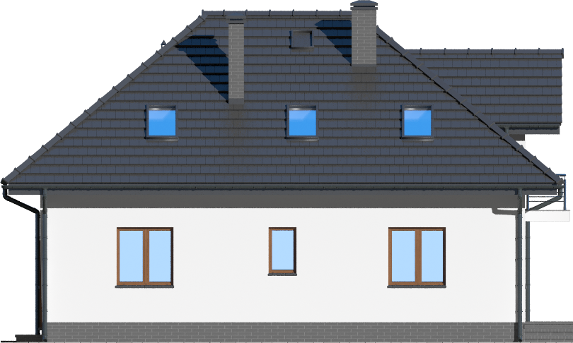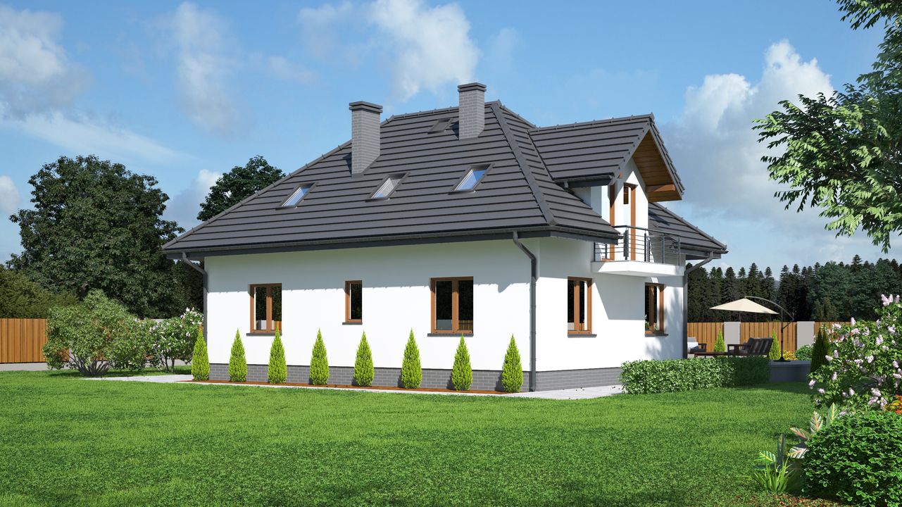 Graficzne opracowanie rzutów poglądowych widocznych na karcie projektu zostało wykonane przez Extradom.pl. Prezentowane przez Extradom.pl wizualizacje wykonane zostały przez autora projektu i należy poczytywać je jedynie za przykład i propozycję wykończenia, wizję architektoniczną autora projektu. Ostateczne wykończenie budynku może nastąpić na wiele sposobów. Szczegółowe rozwiązania zastosowane w oferowanej dokumentacji - w tym również ilość, lokalizacje i wygląd okien, drzwi, kominów - mogą w niewielkim stopniu różnić się od prezentowanej wizualizacji budynku.