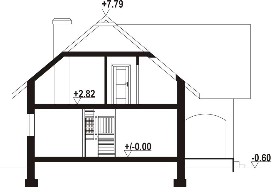 Wysokość ścianki kolankowej: 1.18 m. Strop: płyta żelbetowa. Pokrycie dachu: dachówka ceramiczna. Ściany zewnętrzne: pustaki ceramiczne + styropian. Ściany wewnętrzne: pustaki ceramiczne. Typ ogrzewania: kocioł na paliwo stałe. Instalacje dodatkowe: instalacja solarna. Inne: okna połaciowe Velux.