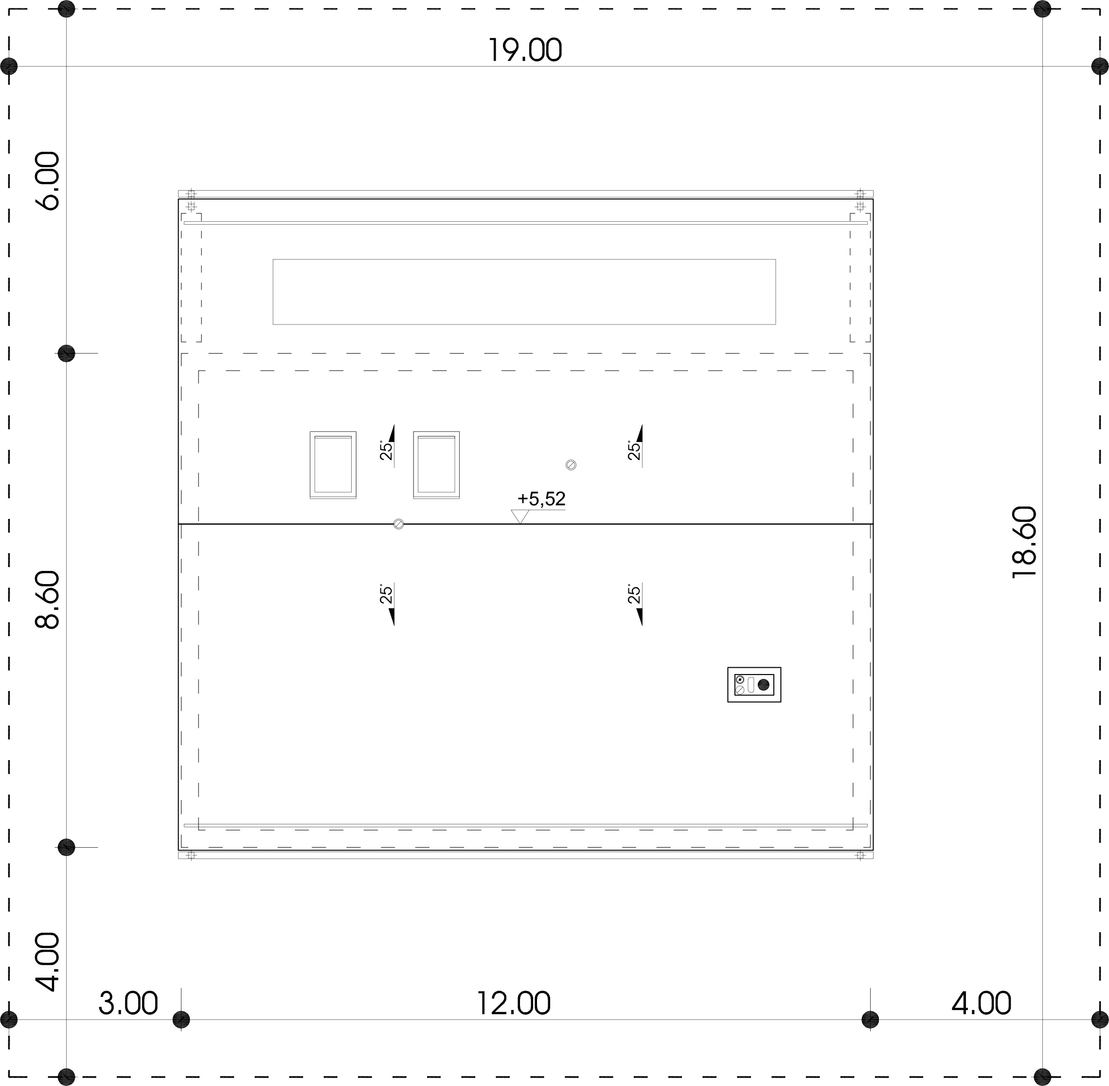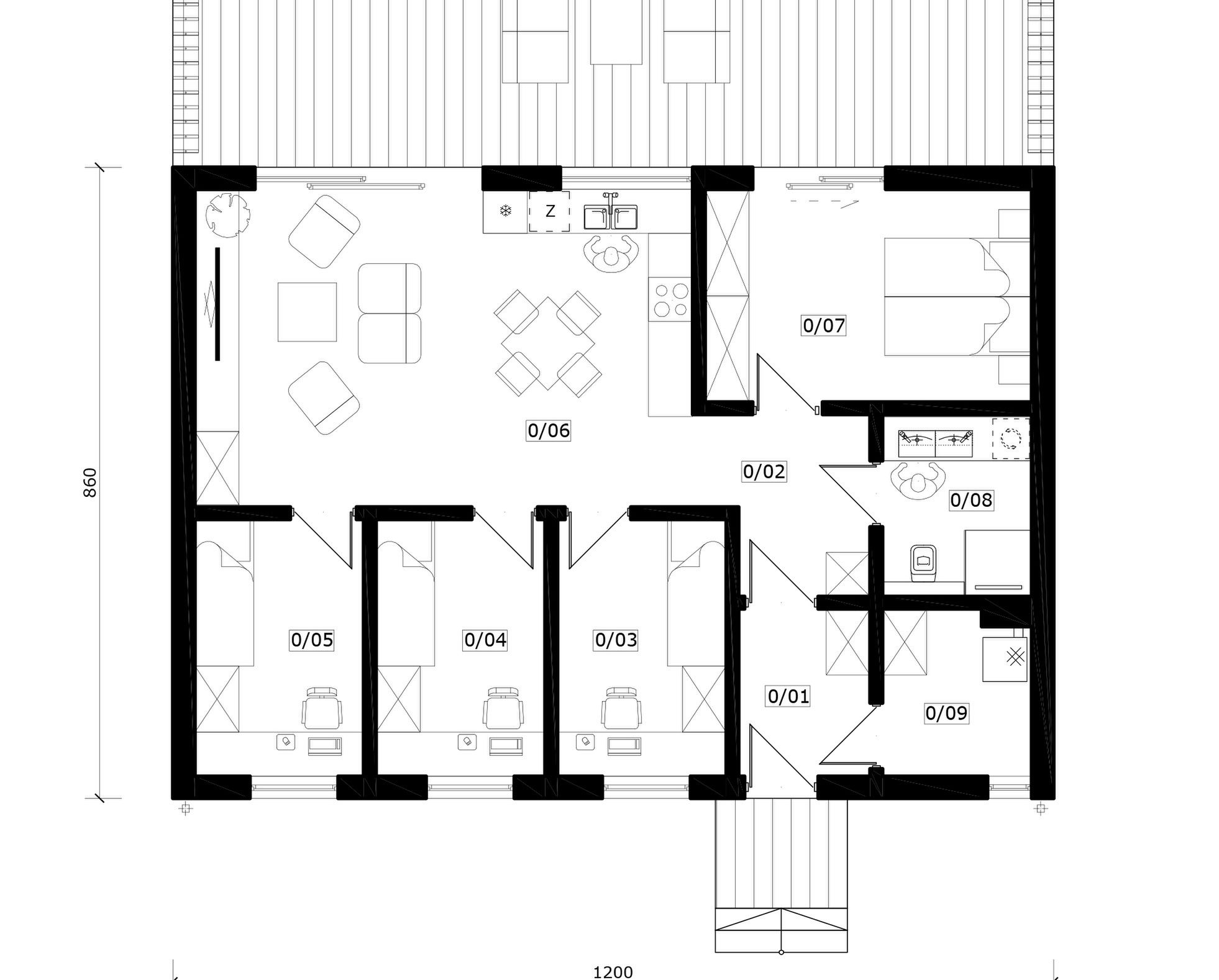 fundamenty: płyta fundamentowa ściany zewnętrzne: szkeletowe drewniane 30cm ściany wewnętrzne: szkieletowe drewniane 17cm strop: przestrzeń otwarta konstrukcja i pokrycie dachu: Wiązar drewniany, blacha elewacja: tynk; deska