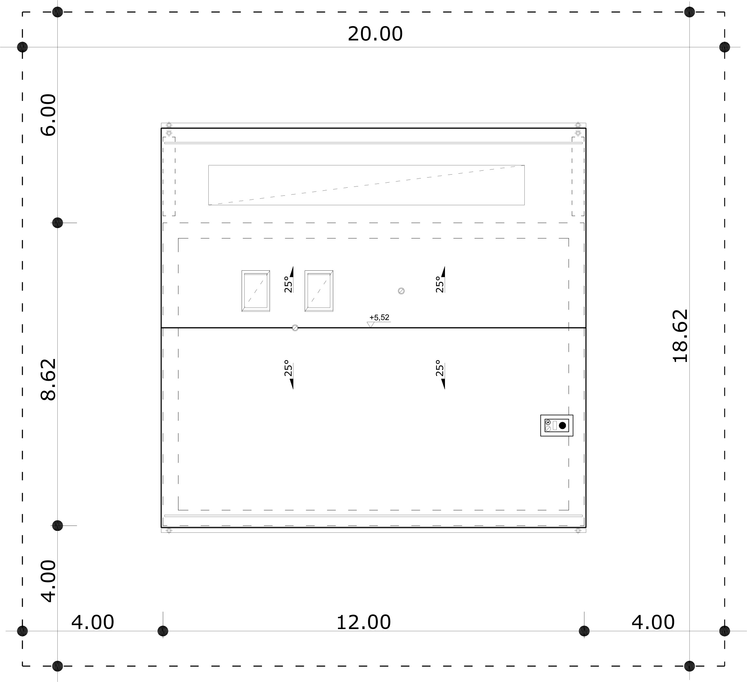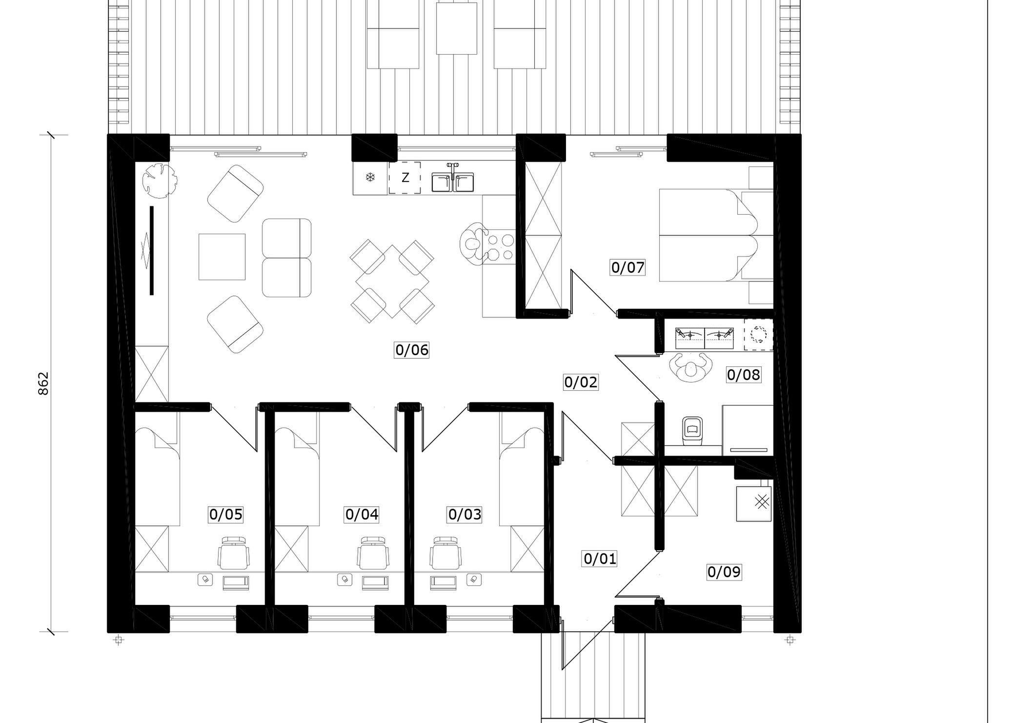 fundamenty: ława fundamentowa; ściany zewnętrzne: gazobeton 24+20 styropian; ściany wewnętrzne: gazobeton 12; strop: przestrzeń otwarta; konstrukcja i pokrycie dachu: Wiązar drewniany, blacha; elewacja: deska;
