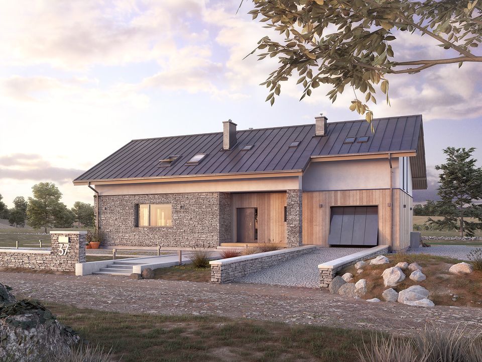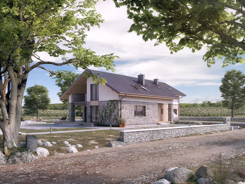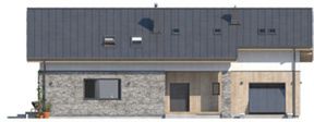 Graficzne opracowanie rzutów poglądowych widocznych na karcie projektu zostało wykonane przez Extradom.pl. Prezentowane przez Extradom.pl wizualizacje wykonane zostały przez autora projektu i należy poczytywać je jedynie za przykład i propozycję wykończenia, wizję architektoniczną autora projektu. Ostateczne wykończenie budynku może nastąpić na wiele sposobów. Szczegółowe rozwiązania zastosowane w oferowanej dokumentacji - w tym również ilość, lokalizacje i wygląd okien, drzwi, kominów - mogą w niewielkim stopniu różnić się od prezentowanej wizualizacji budynku.
