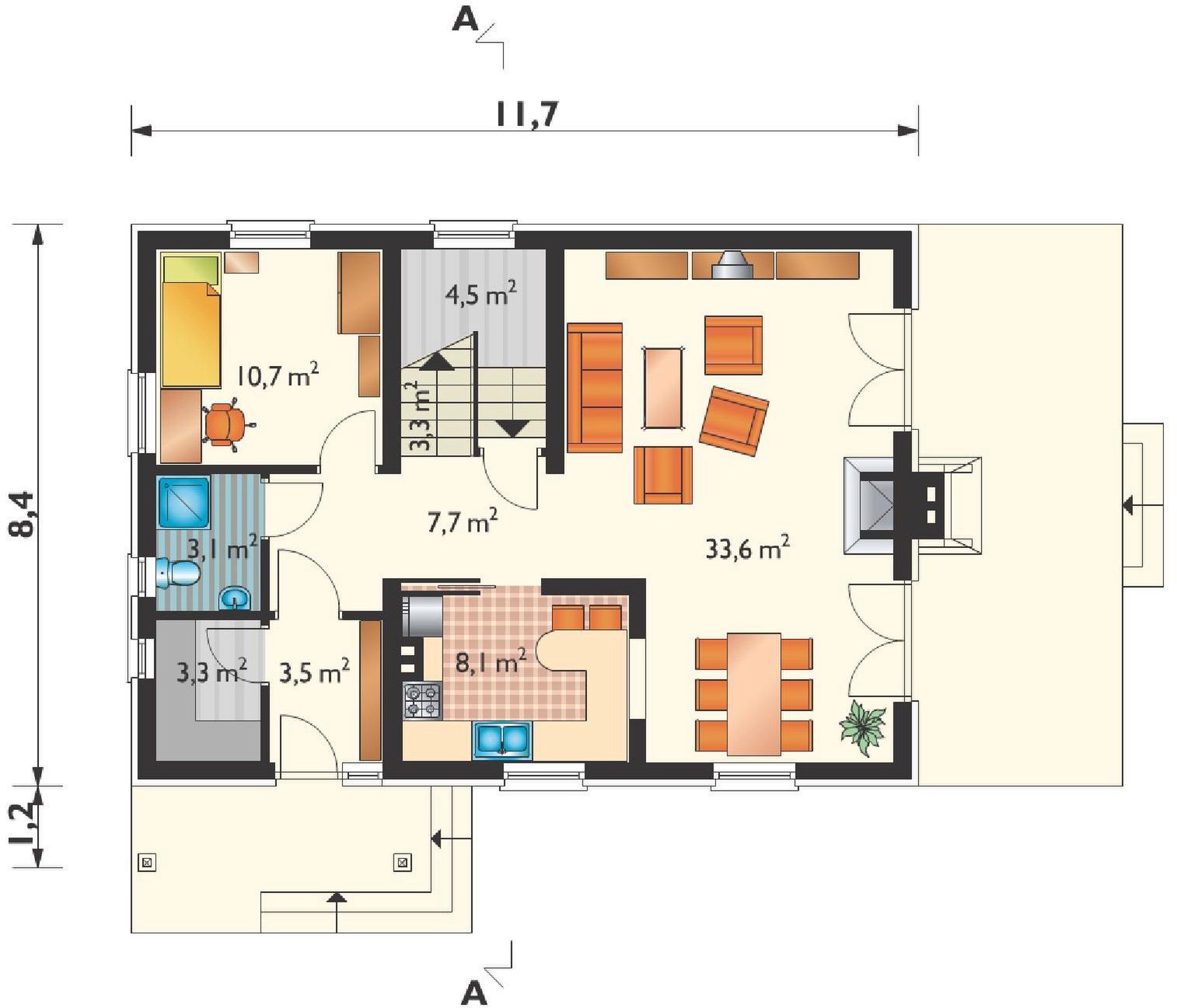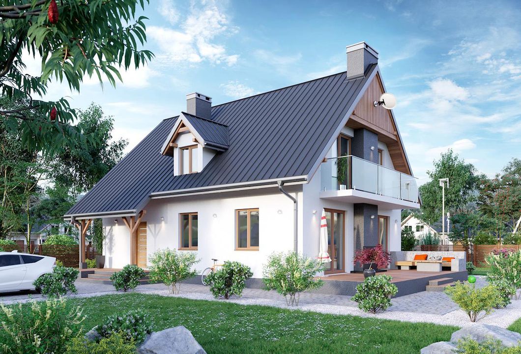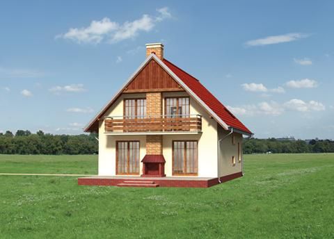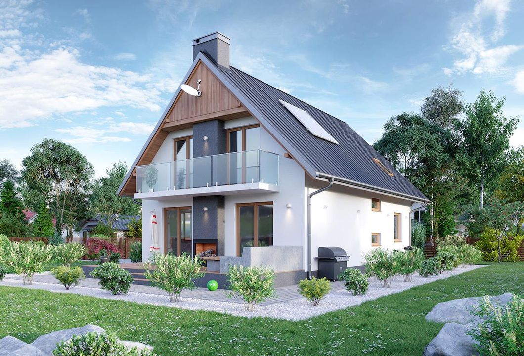 Graficzne opracowanie rzutów poglądowych widocznych na karcie projektu zostało wykonane przez Extradom.pl. Prezentowane przez Extradom.pl wizualizacje wykonane zostały przez autora projektu i należy poczytywać je jedynie za przykład i propozycję wykończenia, wizję architektoniczną autora projektu. Ostateczne wykończenie budynku może nastąpić na wiele sposobów. Szczegółowe rozwiązania zastosowane w oferowanej dokumentacji - w tym również ilość, lokalizacje i wygląd okien, drzwi, kominów - mogą w niewielkim stopniu różnić się od prezentowanej wizualizacji budynku.