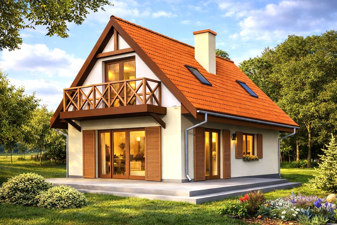 Fundamenty: żelbetowe wylewane. Ściany zewnętrzne: gazobeton 24 + styropian lub porotherm 25 + styropian. Strop: drewniany belkowy. Elewacje: tynk cienkopowłokowy akrylowy. Pokrycie dachu: dachówka ceramiczna lub balchodachówka. Nachylenie dachu: 45 stopni.