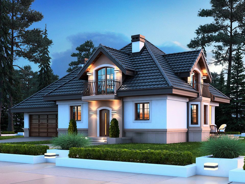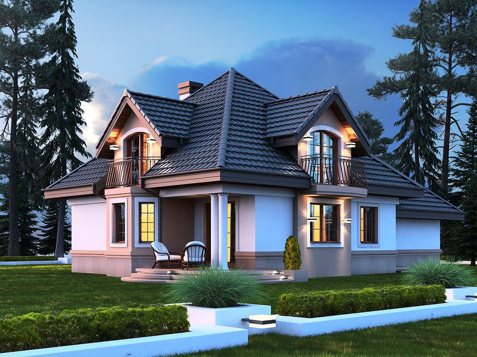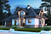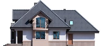 Graficzne opracowanie rzutów poglądowych widocznych na karcie projektu zostało wykonane przez Extradom.pl. Prezentowane przez Extradom.pl wizualizacje wykonane zostały przez autora projektu i należy poczytywać je jedynie za przykład i propozycję wykończenia, wizję architektoniczną autora projektu. Ostateczne wykończenie budynku może nastąpić na wiele sposobów. Szczegółowe rozwiązania zastosowane w oferowanej dokumentacji - w tym również ilość, lokalizacje i wygląd okien, drzwi, kominów - mogą w niewielkim stopniu różnić się od prezentowanej wizualizacji budynku.