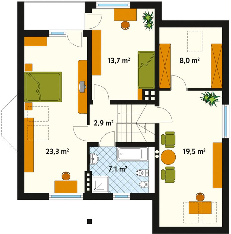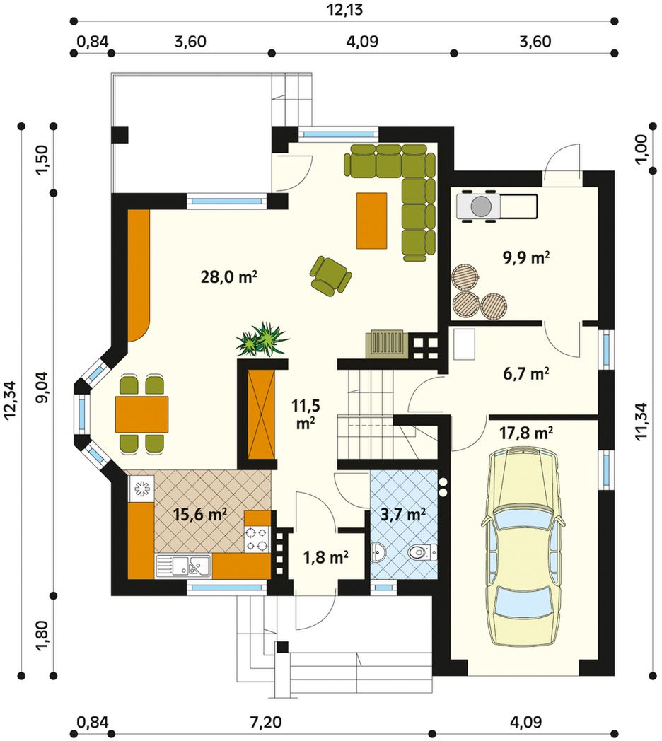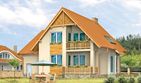 Graficzne opracowanie rzutów poglądowych widocznych na karcie projektu zostało wykonane przez Extradom.pl. Prezentowane przez Extradom.pl wizualizacje wykonane zostały przez autora projektu i należy poczytywać je jedynie za przykład i propozycję wykończenia, wizję architektoniczną autora projektu. Ostateczne wykończenie budynku może nastąpić na wiele sposobów. Szczegółowe rozwiązania zastosowane w oferowanej dokumentacji - w tym również ilość, lokalizacje i wygląd okien, drzwi, kominów - mogą w niewielkim stopniu różnić się od prezentowanej wizualizacji budynku.