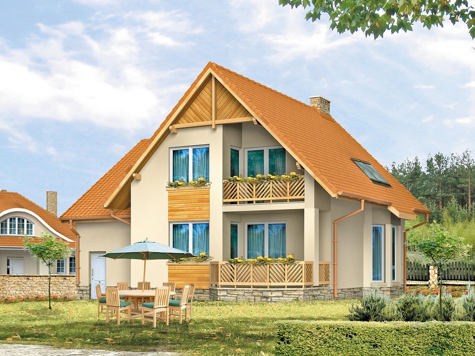 Ściany: beton komórkowy 36,5 cm. Stropy: żelbetowe, wylewane. Pokrycie dachu: dachówka. Ogrzewanie: gazowe lub olejowe.