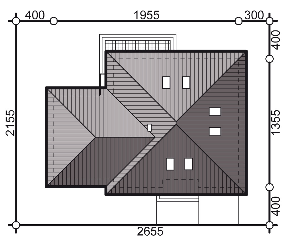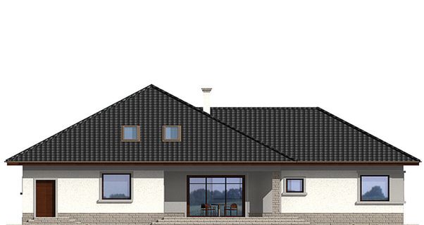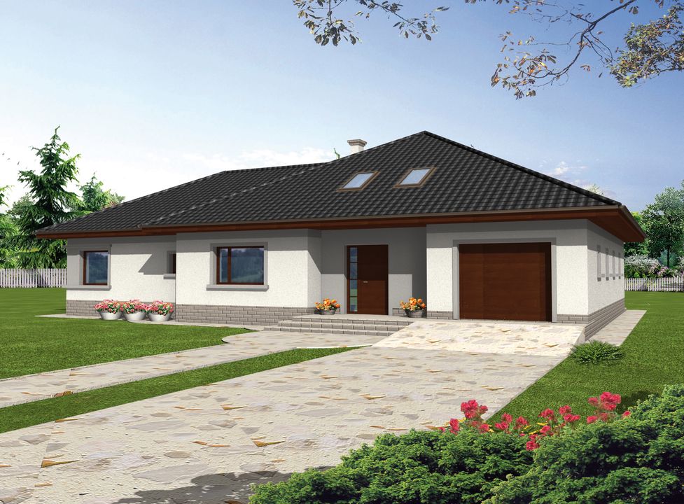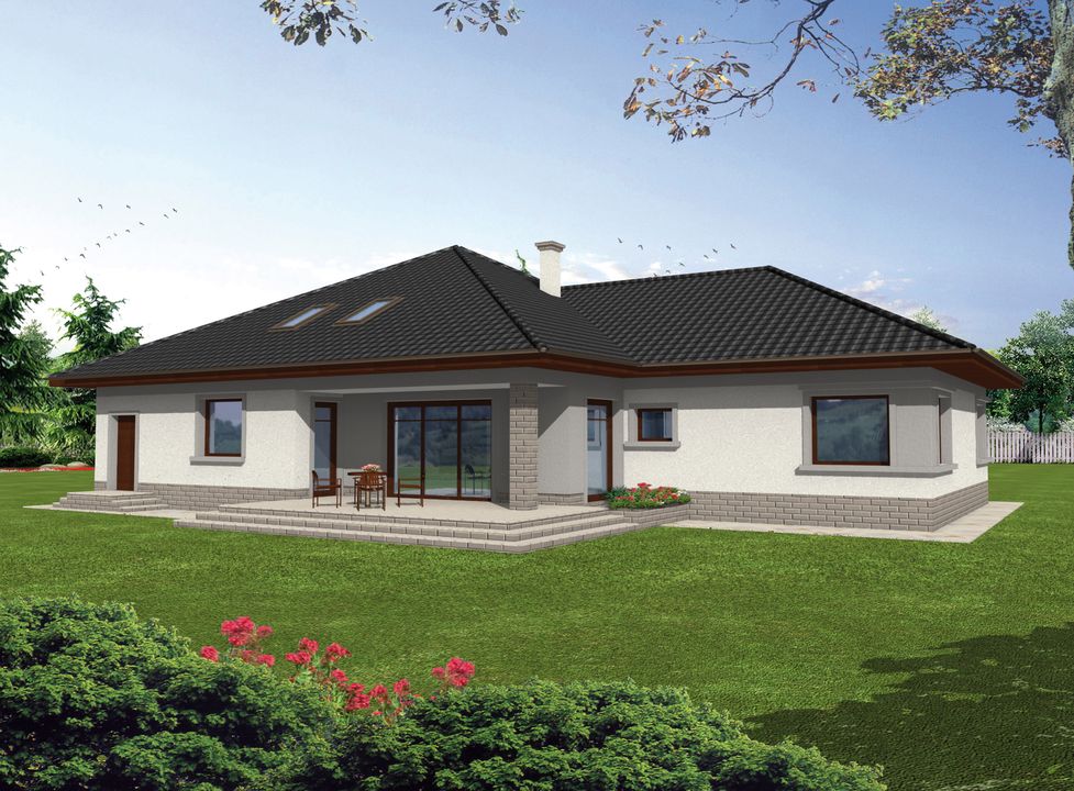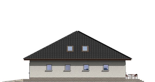 Graficzne opracowanie rzutów poglądowych widocznych na karcie projektu zostało wykonane przez Extradom.pl. Prezentowane przez Extradom.pl wizualizacje wykonane zostały przez autora projektu i należy poczytywać je jedynie za przykład i propozycję wykończenia, wizję architektoniczną autora projektu. Ostateczne wykończenie budynku może nastąpić na wiele sposobów. Szczegółowe rozwiązania zastosowane w oferowanej dokumentacji - w tym również ilość, lokalizacje i wygląd okien, drzwi, kominów - mogą w niewielkim stopniu różnić się od prezentowanej wizualizacji budynku.