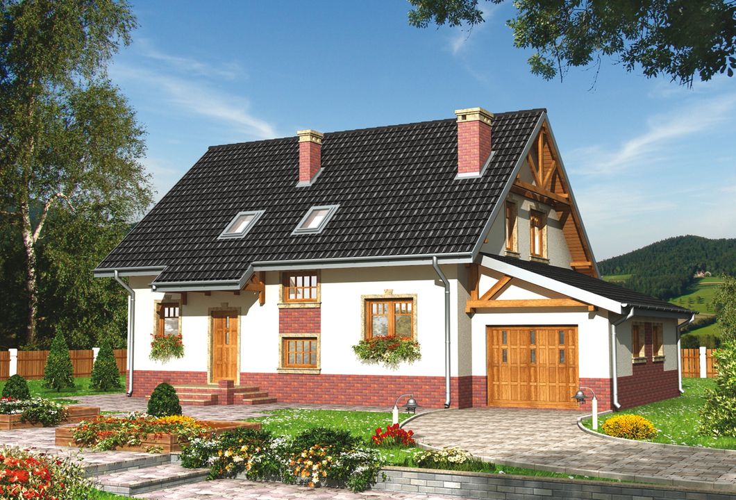 Graficzne opracowanie rzutów poglądowych widocznych na karcie projektu zostało wykonane przez Extradom.pl. Prezentowane przez Extradom.pl wizualizacje wykonane zostały przez autora projektu i należy poczytywać je jedynie za przykład i propozycję wykończenia, wizję architektoniczną autora projektu. Ostateczne wykończenie budynku może nastąpić na wiele sposobów. Szczegółowe rozwiązania zastosowane w oferowanej dokumentacji - w tym również ilość, lokalizacje i wygląd okien, drzwi, kominów - mogą w niewielkim stopniu różnić się od prezentowanej wizualizacji budynku.