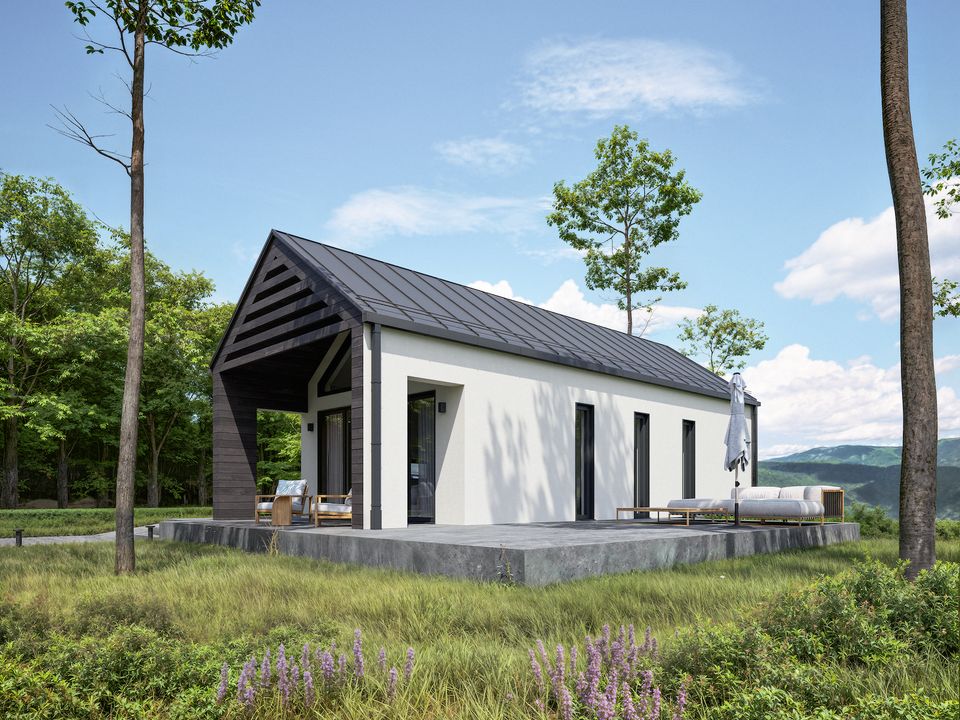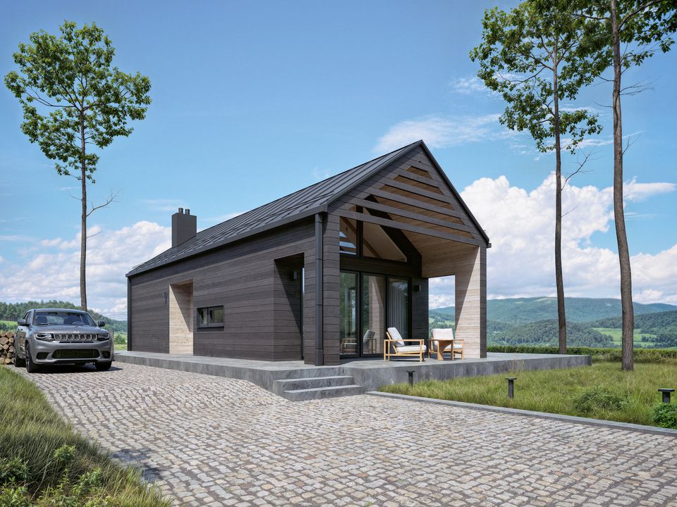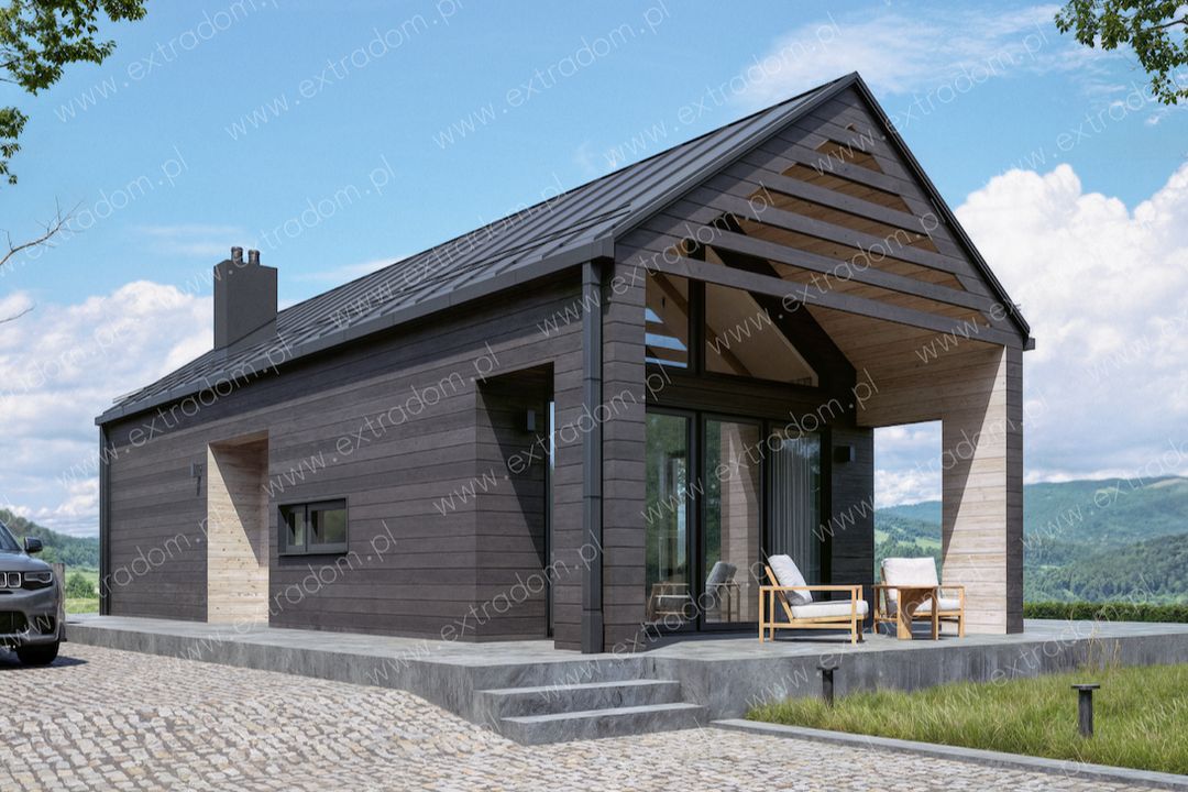 Graficzne opracowanie rzutów poglądowych widocznych na karcie projektu zostało wykonane przez Extradom.pl. Prezentowane przez Extradom.pl wizualizacje wykonane zostały przez autora projektu i należy poczytywać je jedynie za przykład i propozycję wykończenia, wizję architektoniczną autora projektu. Ostateczne wykończenie budynku może nastąpić na wiele sposobów. Szczegółowe rozwiązania zastosowane w oferowanej dokumentacji - w tym również ilość, lokalizacje i wygląd okien, drzwi, kominów - mogą w niewielkim stopniu różnić się od prezentowanej wizualizacji budynku.
