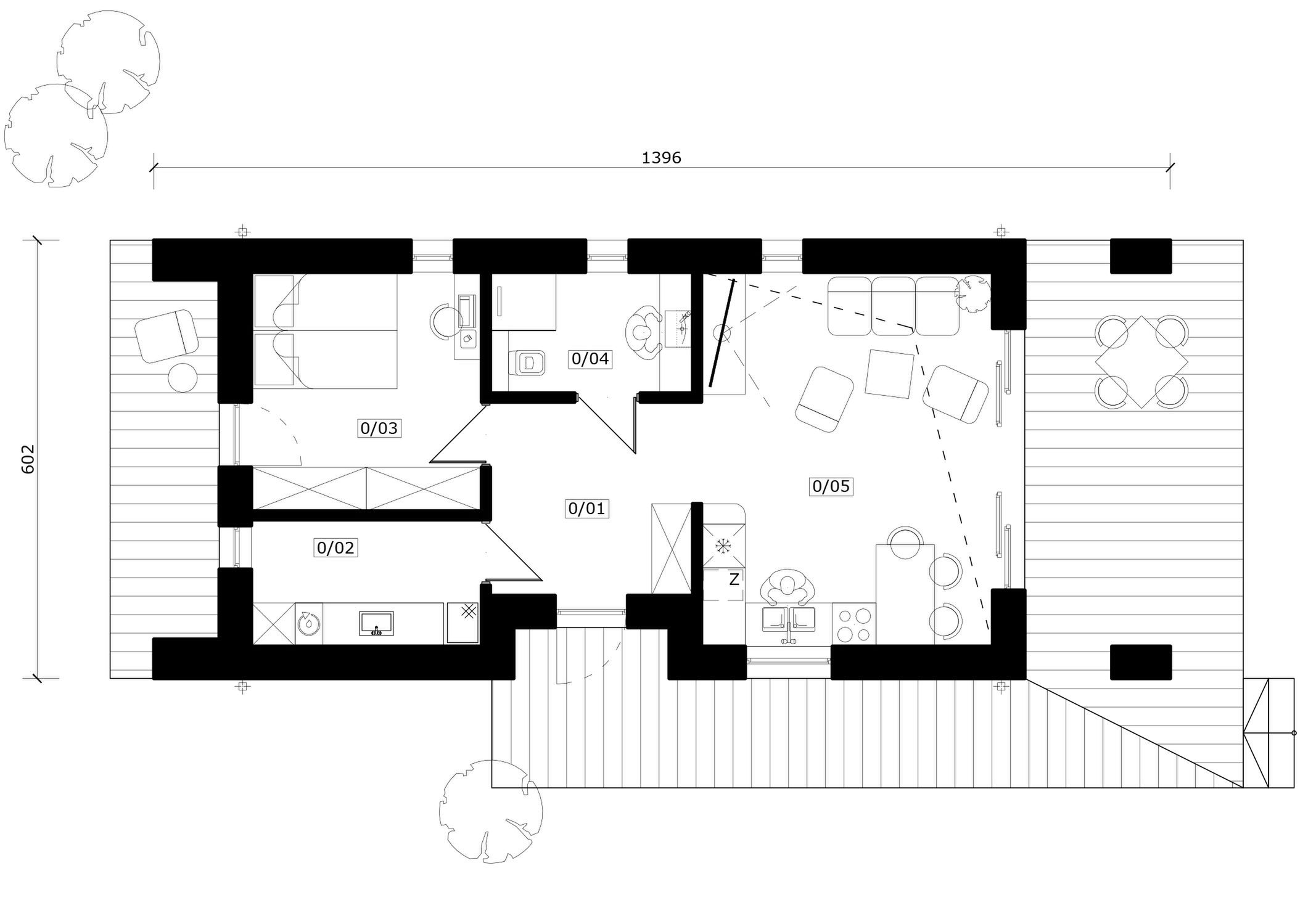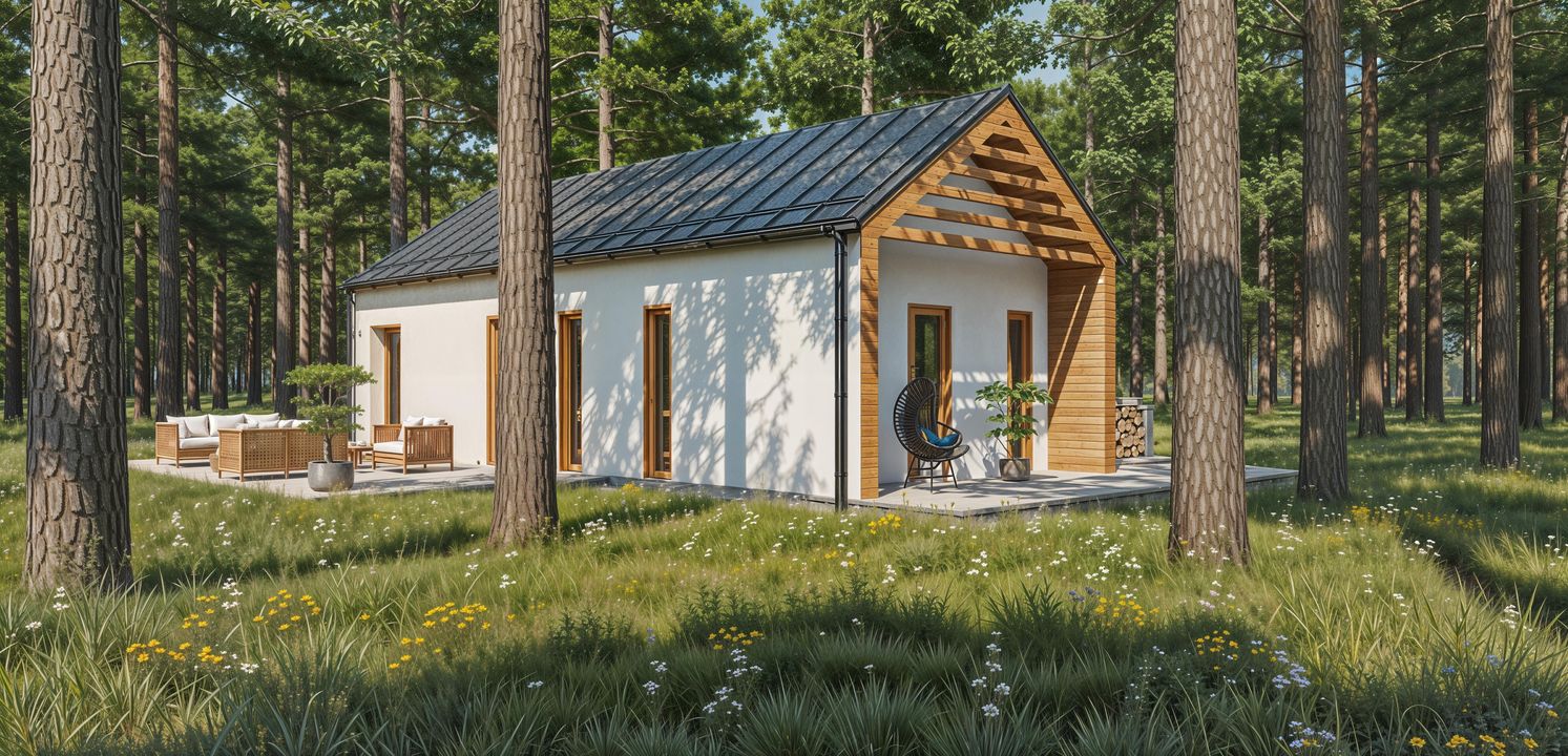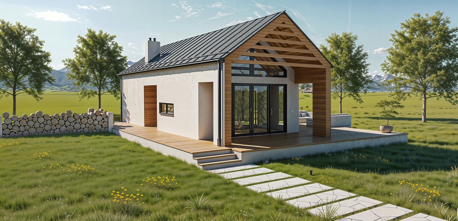 Posadowienie budynku: ława fundamentowa; Ściany zewnętrzne: ściana murowana 24 + styropian 20; Ściany wewnętrzne: ściana murowana 24 + styropian 20; Strop nad parterem: przestrzeń otwarta; Konstrukcja dachu: drewniana jętkowa; Pokrycie dachu: blacha; Elewacja: deska/ tynk;