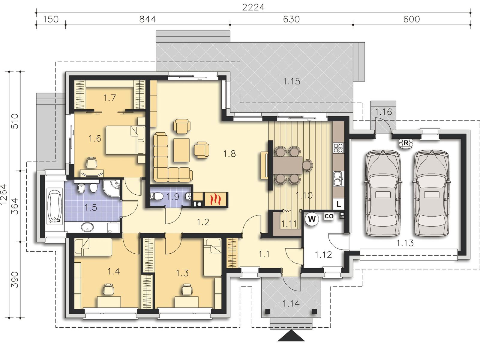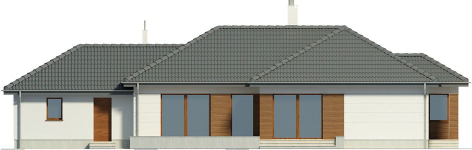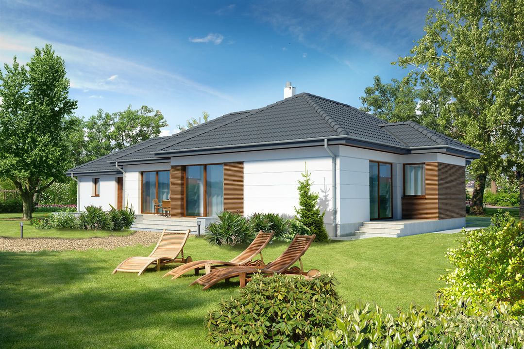 Graficzne opracowanie rzutów poglądowych widocznych na karcie projektu zostało wykonane przez Extradom.pl. Prezentowane przez Extradom.pl wizualizacje wykonane zostały przez autora projektu i należy poczytywać je jedynie za przykład i propozycję wykończenia, wizję architektoniczną autora projektu. Ostateczne wykończenie budynku może nastąpić na wiele sposobów. Szczegółowe rozwiązania zastosowane w oferowanej dokumentacji - w tym również ilość, lokalizacje i wygląd okien, drzwi, kominów - mogą w niewielkim stopniu różnić się od prezentowanej wizualizacji budynku.