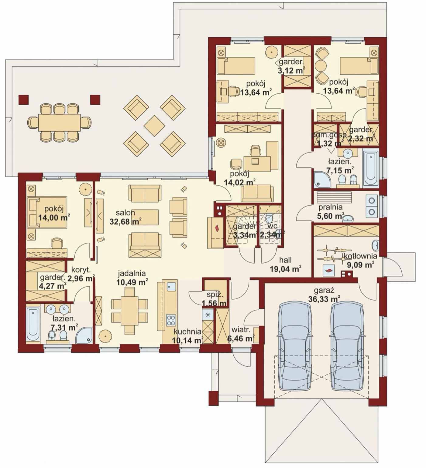 Graficzne opracowanie rzutów poglądowych widocznych na karcie projektu zostało wykonane przez Extradom.pl. Prezentowane przez Extradom.pl wizualizacje wykonane zostały przez autora projektu i należy poczytywać je jedynie za przykład i propozycję wykończenia, wizję architektoniczną autora projektu. Ostateczne wykończenie budynku może nastąpić na wiele sposobów. Szczegółowe rozwiązania zastosowane w oferowanej dokumentacji - w tym również ilość, lokalizacje i wygląd okien, drzwi, kominów - mogą w niewielkim stopniu różnić się od prezentowanej wizualizacji budynku.