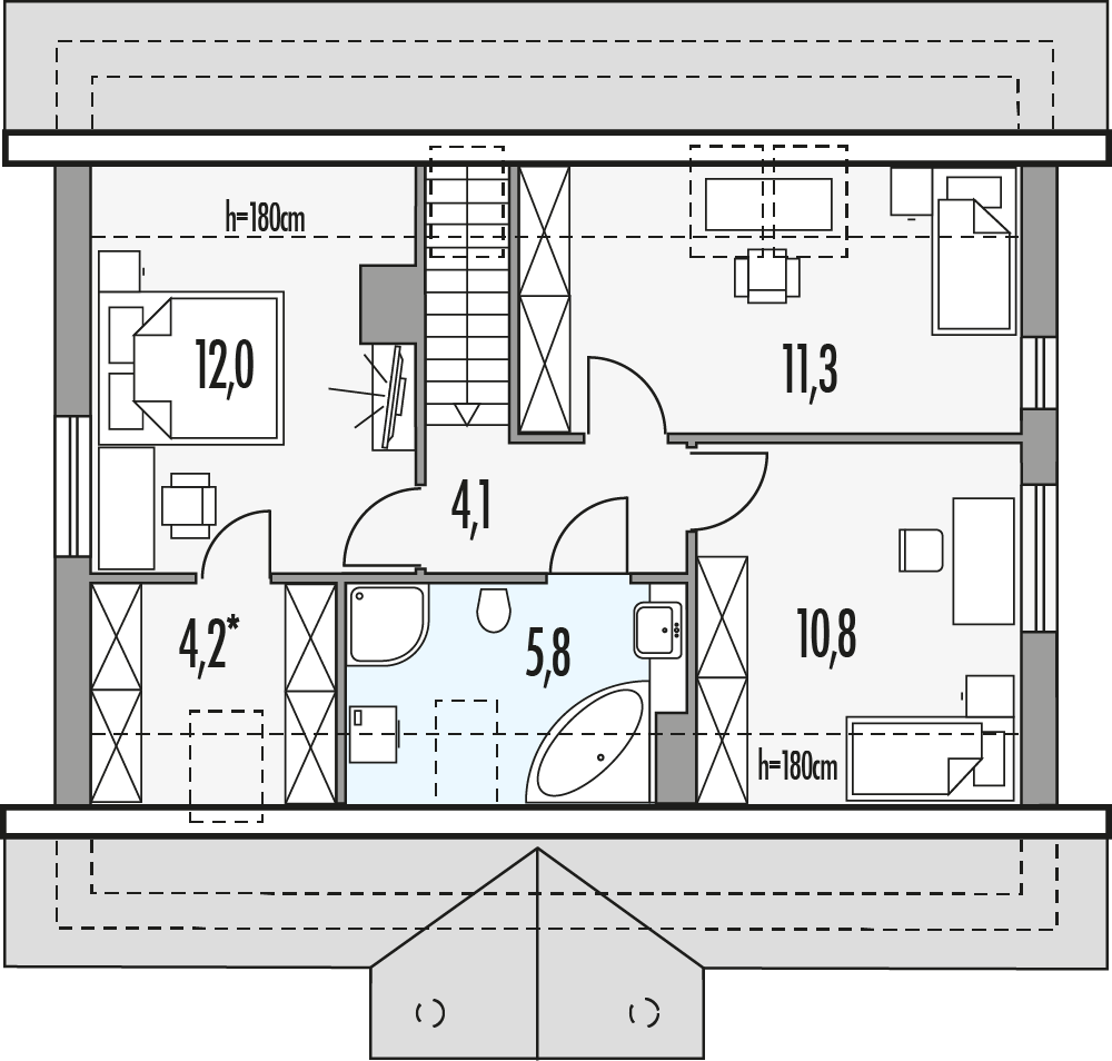 Strop: gęstożebrowy Teriva I. Ściany zewnętrzne: silikat 24 + styropian Termonium Fasada 14cm. Pokrycie dachowe: dachówka ceramiczna. Okna połaciowe: Velux.
