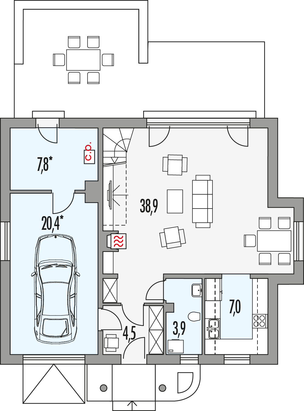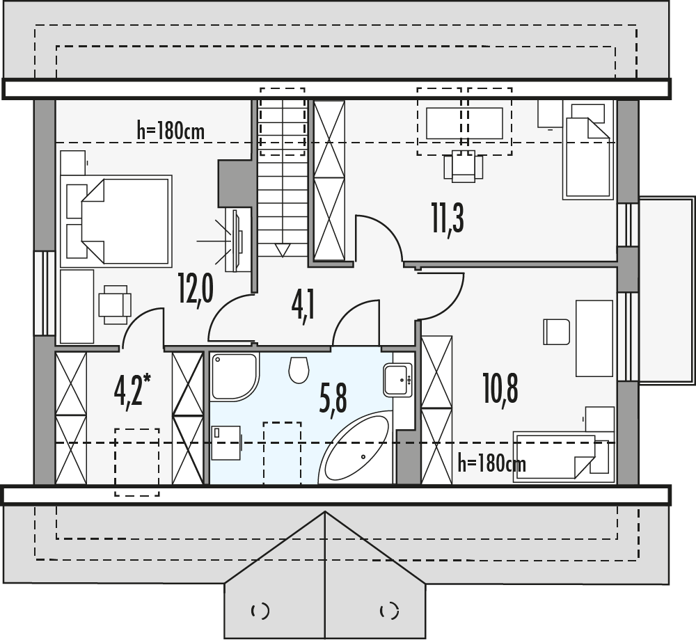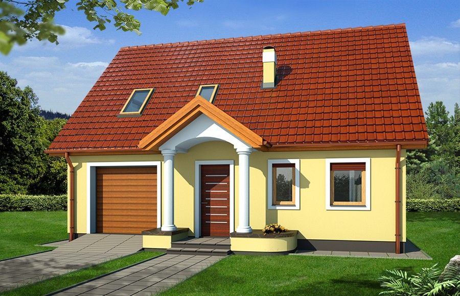 Graficzne opracowanie rzutów poglądowych widocznych na karcie projektu zostało wykonane przez Extradom.pl. Prezentowane przez Extradom.pl wizualizacje wykonane zostały przez autora projektu i należy poczytywać je jedynie za przykład i propozycję wykończenia, wizję architektoniczną autora projektu. Ostateczne wykończenie budynku może nastąpić na wiele sposobów. Szczegółowe rozwiązania zastosowane w oferowanej dokumentacji - w tym również ilość, lokalizacje i wygląd okien, drzwi, kominów - mogą w niewielkim stopniu różnić się od prezentowanej wizualizacji budynku.