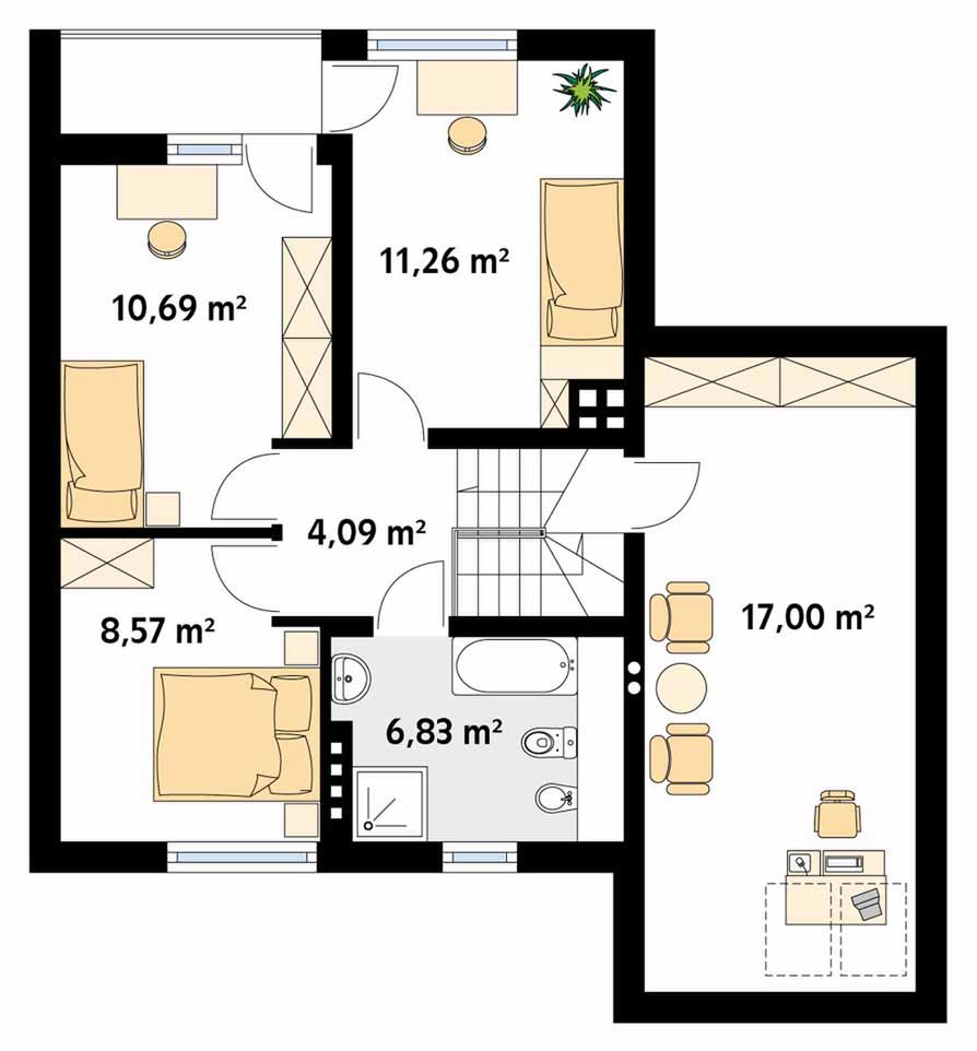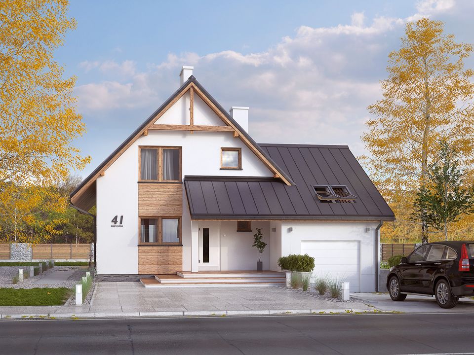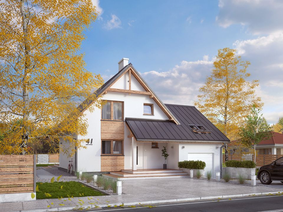 Graficzne opracowanie rzutów poglądowych widocznych na karcie projektu zostało wykonane przez Extradom.pl. Prezentowane przez Extradom.pl wizualizacje wykonane zostały przez autora projektu i należy poczytywać je jedynie za przykład i propozycję wykończenia, wizję architektoniczną autora projektu. Ostateczne wykończenie budynku może nastąpić na wiele sposobów. Szczegółowe rozwiązania zastosowane w oferowanej dokumentacji - w tym również ilość, lokalizacje i wygląd okien, drzwi, kominów - mogą w niewielkim stopniu różnić się od prezentowanej wizualizacji budynku.
