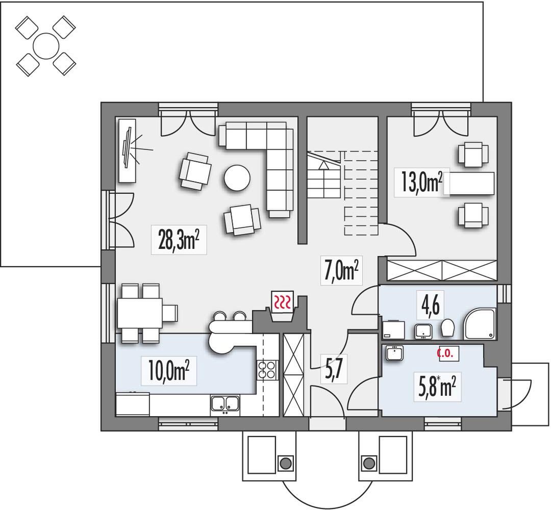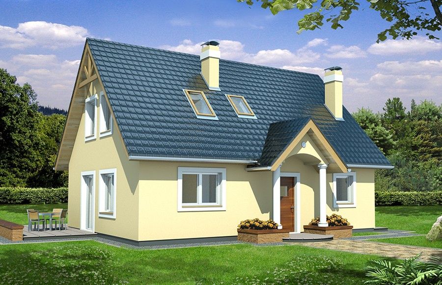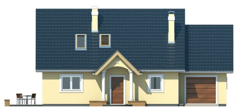 Graficzne opracowanie rzutów poglądowych widocznych na karcie projektu zostało wykonane przez Extradom.pl. Prezentowane przez Extradom.pl wizualizacje wykonane zostały przez autora projektu i należy poczytywać je jedynie za przykład i propozycję wykończenia, wizję architektoniczną autora projektu. Ostateczne wykończenie budynku może nastąpić na wiele sposobów. Szczegółowe rozwiązania zastosowane w oferowanej dokumentacji - w tym również ilość, lokalizacje i wygląd okien, drzwi, kominów - mogą w niewielkim stopniu różnić się od prezentowanej wizualizacji budynku.
