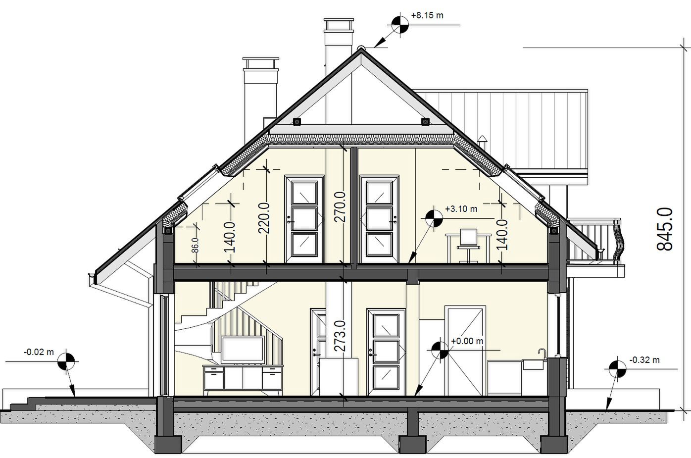 Posadowienie bezpośrednie na zbrojonych ławach i stopach fundamentowych wykonanych z betonu B 20. Ściany fundamentowe: murowane z bloczków betonowych M6. Ściany zewnętrzne: bloczki gazobetonowe gr. 25cm na zaprawie systemowej, ciepłochronnej, ocieplony styropianem fasadowym gr. 15cm. Do ocieplenia budynku zaprojektowano użycie styropianu grafitowego gr. 15 cm, o współczynniku „lambda” nie przekraczającym 0,035 W(mK) i „oporze cieplnym” nie mniejszym niż Rd – 4,0 m2k/W. Zastosowanie materiałów budowlanych (ocieplenie ścian, dachu, podłogi na gruncie, okien i drzwi zewnętrznych) użytych w projekcie odpowiada nowym wymaganiom obowiązującym od stycznia 2021 roku (WT2021). Ściany nośne wewnętrzne: bloczki gazobetonowe gr. 25cm na zaprawie cementowo-wapiennej lub systemowej. Ściany wewnętrzne działowe: bloczki gazobetonowe gr. 12cm. Strop gęstożebrowy z wypełnieniem pustakami betonowymi, zalewany wraz z wieńcami betonem B 20. Konstrukcja dachu: drewniana, drewno klasy C24, więźba dachowa krokwiowo-jętkowa. Budynek, w wersji podstawowej, jest zaprojektowany z pomieszczeniem kotłowni wyposażonej w kocioł ekologiczny na paliwo stałe, biomasę (granulat drzewny – pellet) i spełnia wszystkie wymagania dotyczące WT2021. Istnieje możliwość zamówienia dokumentacji projektowej w wersji ogrzewania gazowego ze wspomaganiem instalacją solarną lub ogrzewania nowoczesną pompa ciepła typu powietrze – woda i ogrzewaniem podłogowym (zapytaj o cenę). Standard energetyczny budynku, w każdej wersji ogrzewania jest w pełni spełniający wymagania WT2021. Projekt pod względem konstrukcyjnym spełnia normy zgodne z Eurokodami.