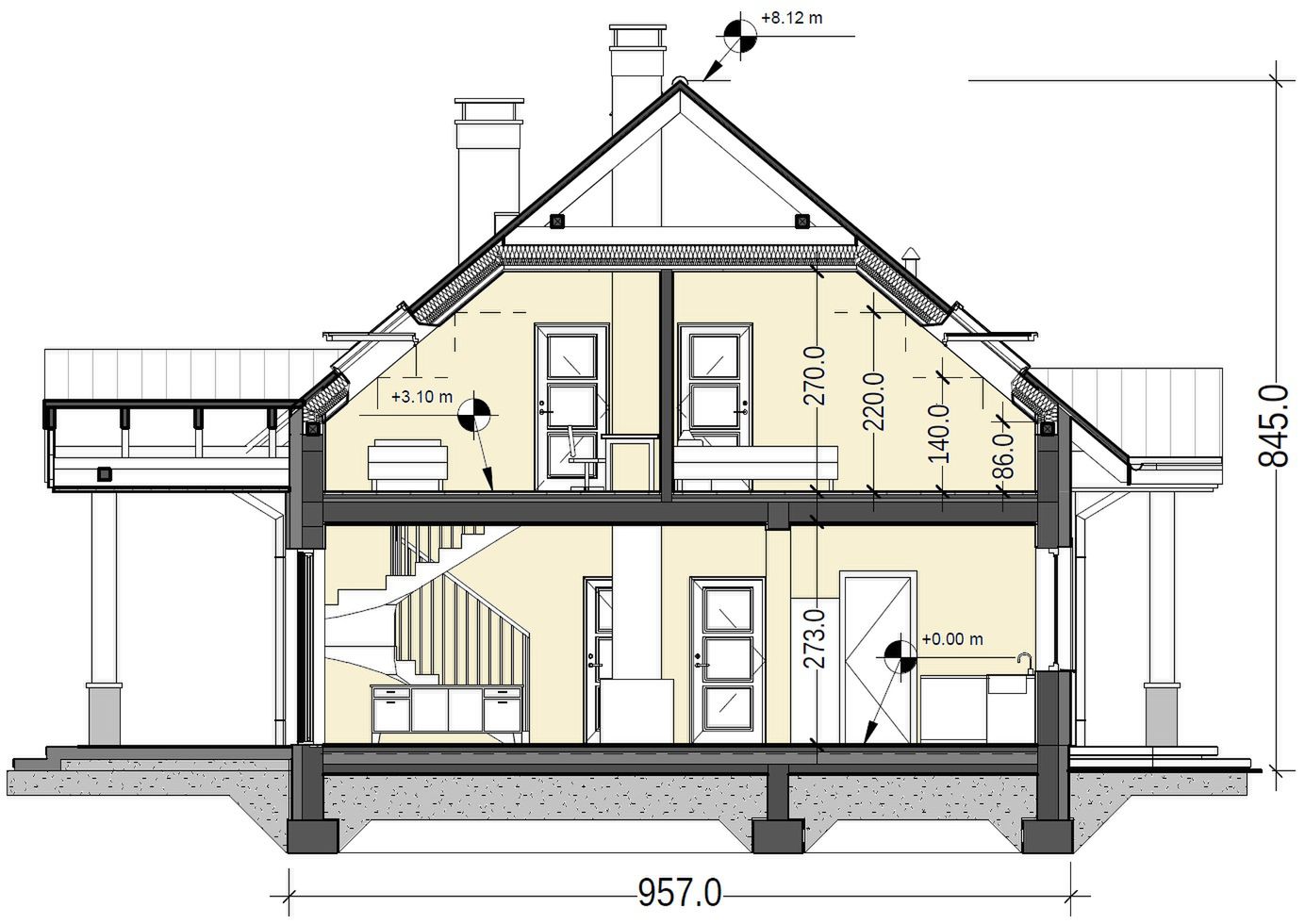 Posadowienie bezpośrednie na zbrojonych ławach i stopach fundamentowych wykonanych z betonu B 20. Ściany fundamentowe: murowane z bloczków betonowych M6. Ściany zewnętrzne: bloczki gazobetonowe gr. 25cm na zaprawie systemowej, ciepłochronnej, ocieplony styropianem fasadowym gr. 15cm. Do ocieplenia budynku zaprojektowano użycie styropianu grafitowego gr. 15 cm, o współczynniku „lambda” nie przekraczającym 0,035 W(mK) i „oporze cieplnym” nie mniejszym niż Rd – 4,0 m2k/W. Zastosowanie materiałów budowlanych (ocieplenie ścian, dachu, podłogi na gruncie, okien i drzwi zewnętrznych) użytych w projekcie odpowiada nowym wymaganiom obowiązującym od stycznia 2021 roku (WT2021). Ściany nośne wewnętrzne: bloczki gazobetonowe gr. 25cm na zaprawie cementowo-wapiennej lub systemowej. Ściany wewnętrzne działowe: bloczki gazobetonowe gr. 12cm. Strop gęstożebrowy z wypełnieniem pustakami betonowymi, zalewany wraz z wieńcami betonem B 20. Konstrukcja dachu: drewniana, drewno klasy C24, więźba dachowa krokwiowo-jętkowa. Budynek, w wersji podstawowej, jest zaprojektowany z pomieszczeniem kotłowni wyposażonej w kocioł ekologiczny na paliwo stałe „pellet” i spełnia wszystkie wymagania dotyczące WT2021. Na etapie adaptacji projektu jest możliwość zaprojektowania ogrzewania gazowego ze wspomaganiem instalacją solarną lub ogrzewania nowoczesną pompa ciepła typu powietrze – woda. Projekt pod względem konstrukcyjnym spełnia normy zgodne z Eurokodami.
