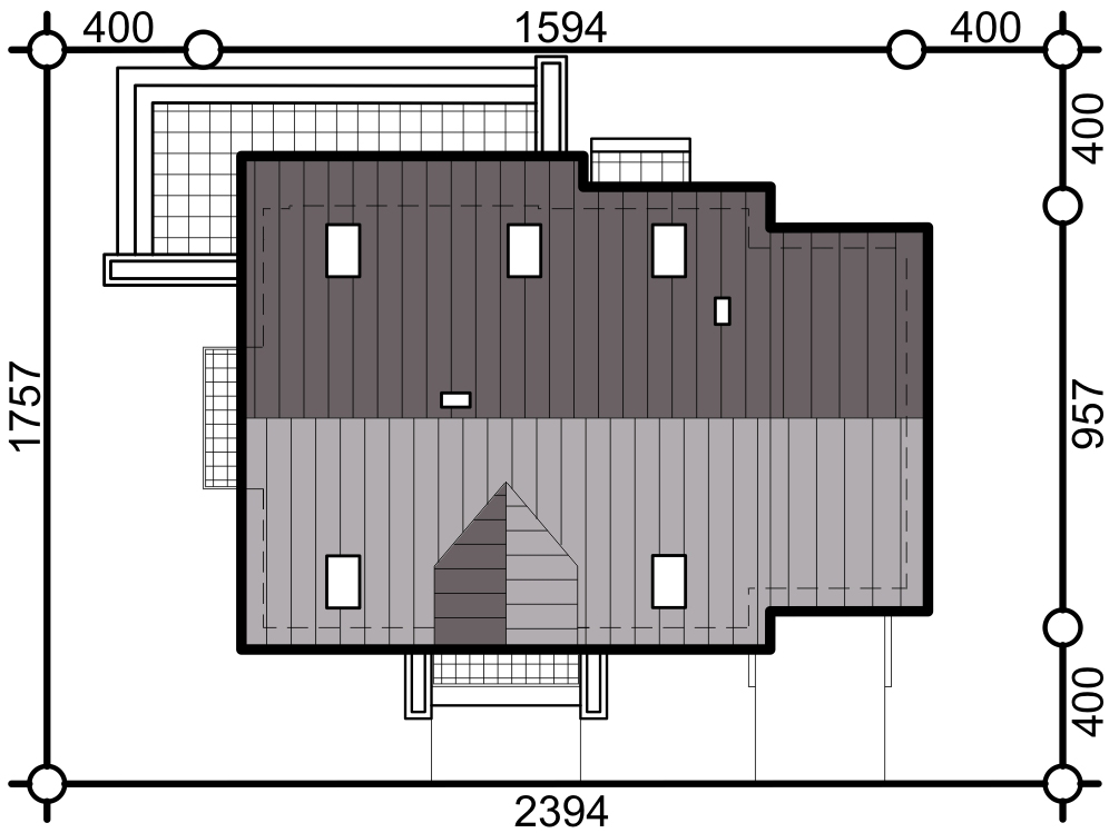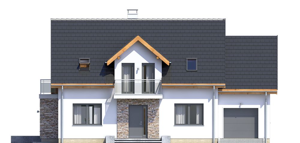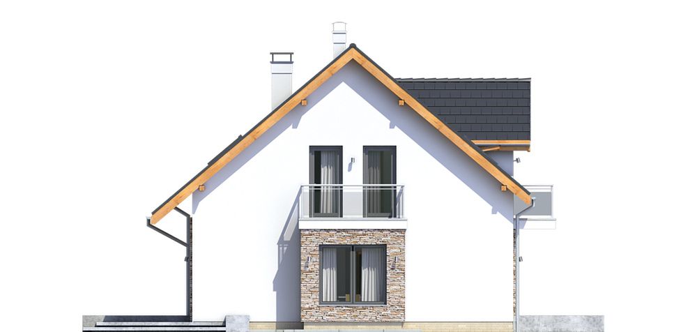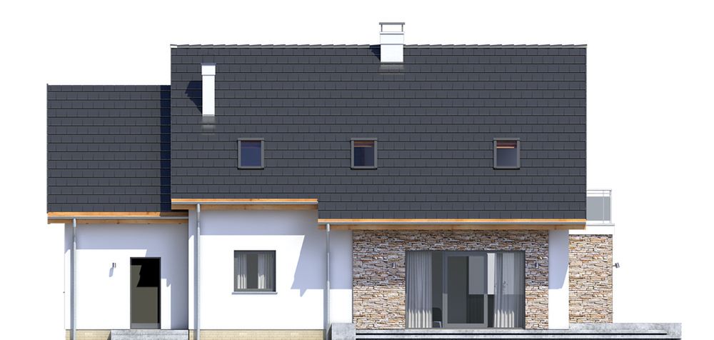 Graficzne opracowanie rzutów poglądowych widocznych na karcie projektu zostało wykonane przez Extradom.pl. Prezentowane przez Extradom.pl wizualizacje wykonane zostały przez autora projektu i należy poczytywać je jedynie za przykład i propozycję wykończenia, wizję architektoniczną autora projektu. Ostateczne wykończenie budynku może nastąpić na wiele sposobów. Szczegółowe rozwiązania zastosowane w oferowanej dokumentacji - w tym również ilość, lokalizacje i wygląd okien, drzwi, kominów - mogą w niewielkim stopniu różnić się od prezentowanej wizualizacji budynku.