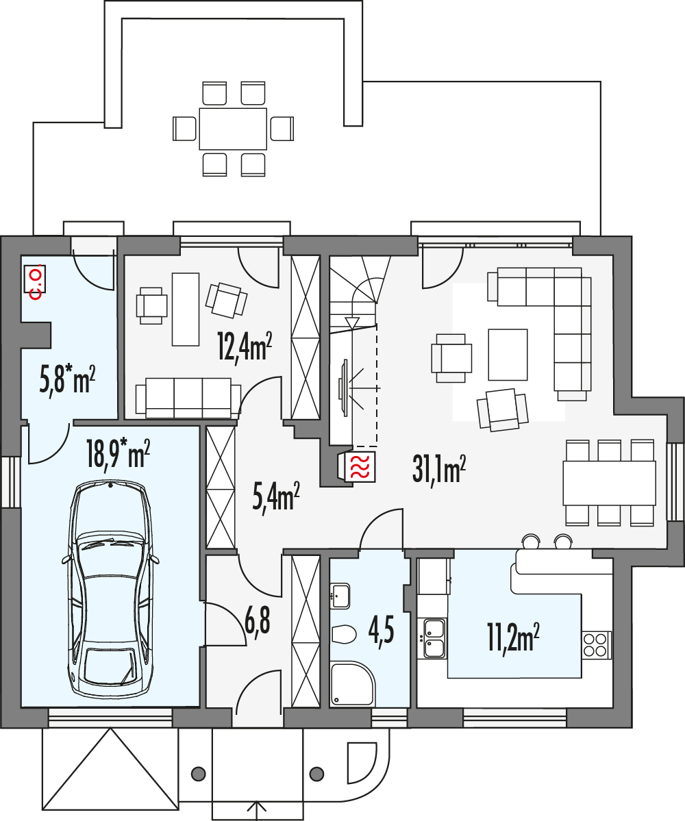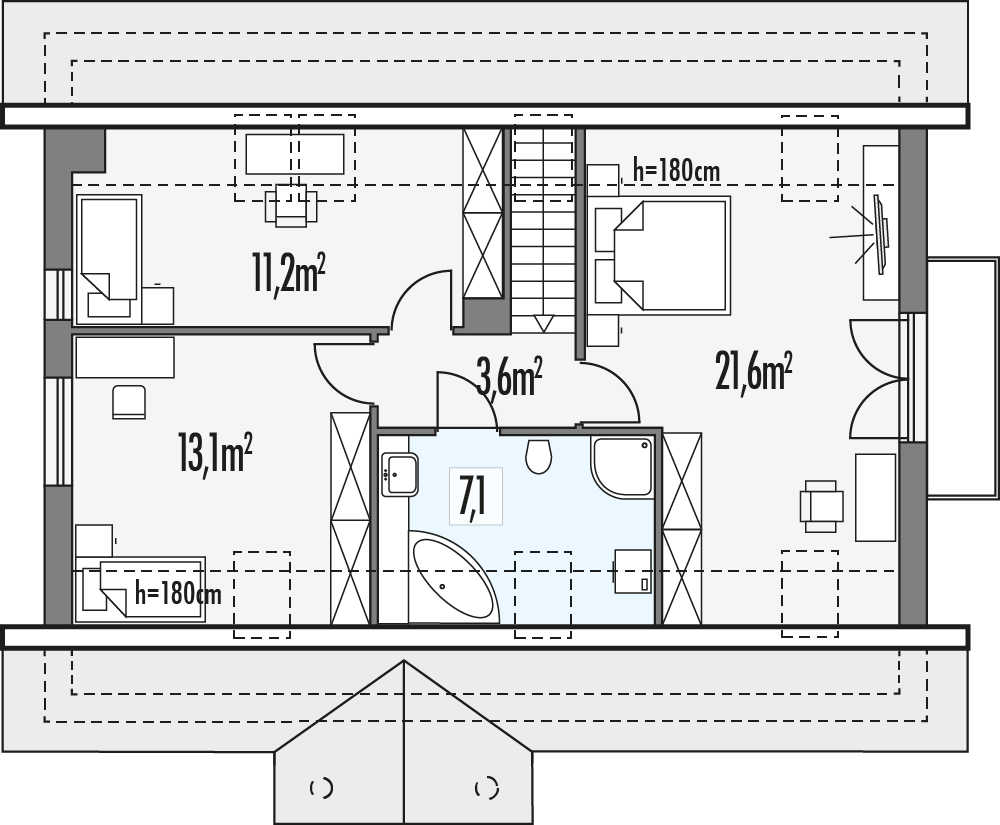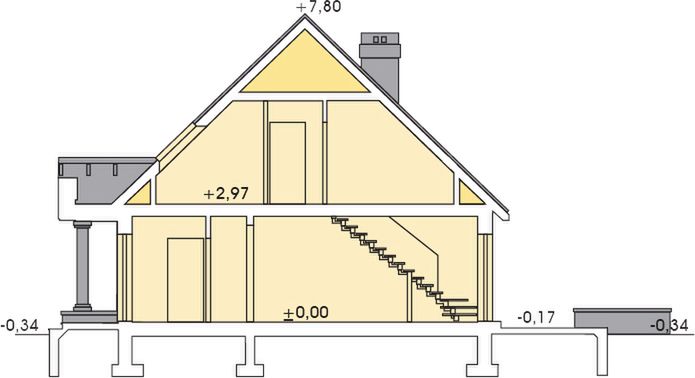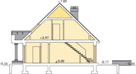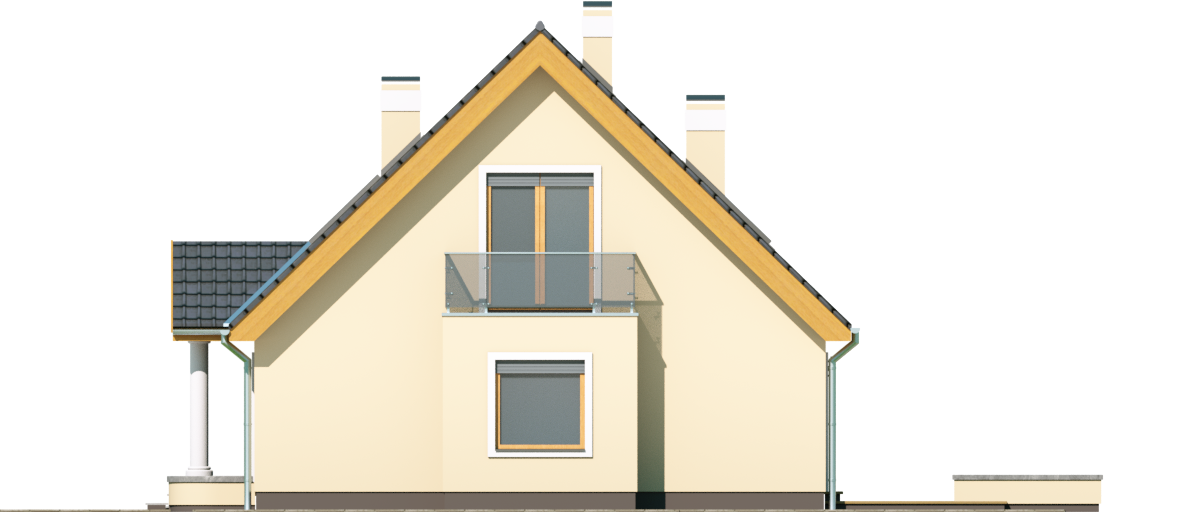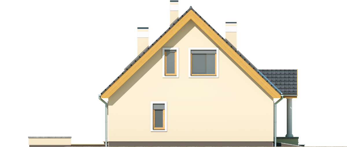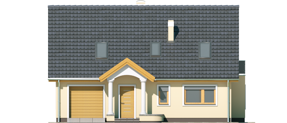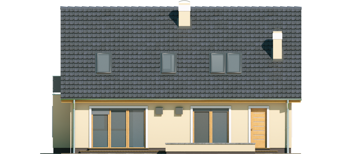 Graficzne opracowanie rzutów poglądowych widocznych na karcie projektu zostało wykonane przez Extradom.pl. Prezentowane przez Extradom.pl wizualizacje wykonane zostały przez autora projektu i należy poczytywać je jedynie za przykład i propozycję wykończenia, wizję architektoniczną autora projektu. Ostateczne wykończenie budynku może nastąpić na wiele sposobów. Szczegółowe rozwiązania zastosowane w oferowanej dokumentacji - w tym również ilość, lokalizacje i wygląd okien, drzwi, kominów - mogą w niewielkim stopniu różnić się od prezentowanej wizualizacji budynku.