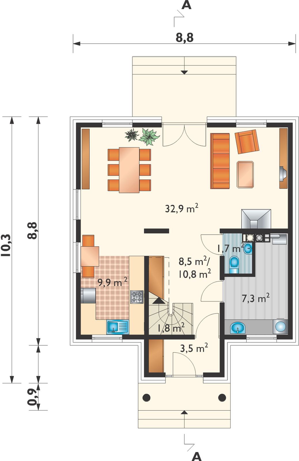Technologia i konstrukcja: murowana – silikaty. Ściany zewnętrzne: bloczki silikatowe + wełna mineralna. Ściany wewnętrzne: bloczki silikatowe. Strop: żelbetowy. Konstrukcja dachu: drewniana, jętkowa. Rodzaj schodów: żelbetowe. Typ ogrzewania: kocioł na węgiel lub kocioł gazowy Alternatywne ogrzewanie na gaz: tak. Pokrycie dachu: blacha dachówkowa. Elewacja: tynk cienkowarstwowy, klinkier.
