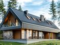 Graficzne opracowanie rzutów poglądowych widocznych na karcie projektu zostało wykonane przez Extradom.pl. Prezentowane przez Extradom.pl wizualizacje wykonane zostały przez autora projektu i należy poczytywać je jedynie za przykład i propozycję wykończenia, wizję architektoniczną autora projektu. Ostateczne wykończenie budynku może nastąpić na wiele sposobów. Szczegółowe rozwiązania zastosowane w oferowanej dokumentacji - w tym również ilość, lokalizacje i wygląd okien, drzwi, kominów - mogą w niewielkim stopniu różnić się od prezentowanej wizualizacji budynku.