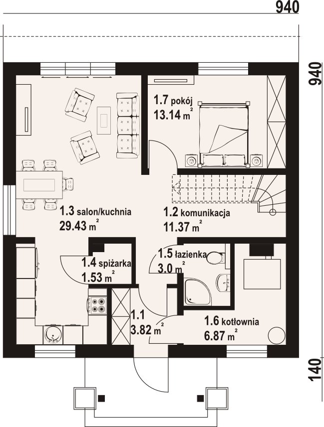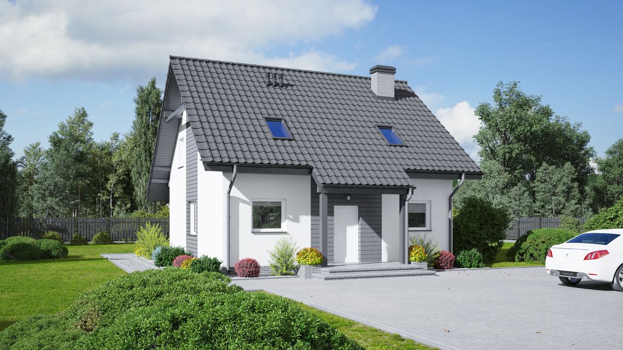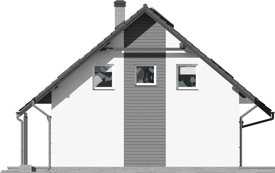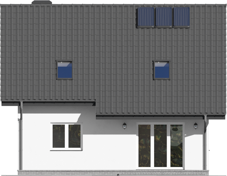 Graficzne opracowanie rzutów poglądowych widocznych na karcie projektu zostało wykonane przez Extradom.pl. Prezentowane przez Extradom.pl wizualizacje wykonane zostały przez autora projektu i należy poczytywać je jedynie za przykład i propozycję wykończenia, wizję architektoniczną autora projektu. Ostateczne wykończenie budynku może nastąpić na wiele sposobów. Szczegółowe rozwiązania zastosowane w oferowanej dokumentacji - w tym również ilość, lokalizacje i wygląd okien, drzwi, kominów - mogą w niewielkim stopniu różnić się od prezentowanej wizualizacji budynku.