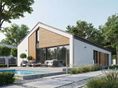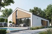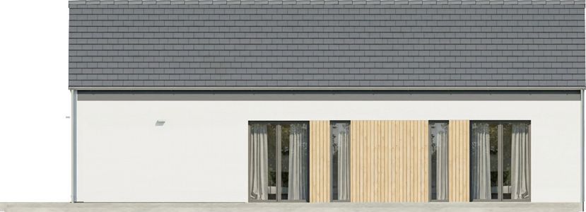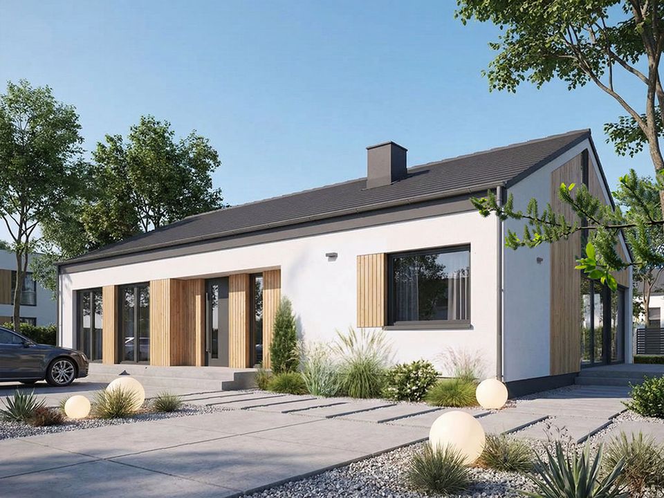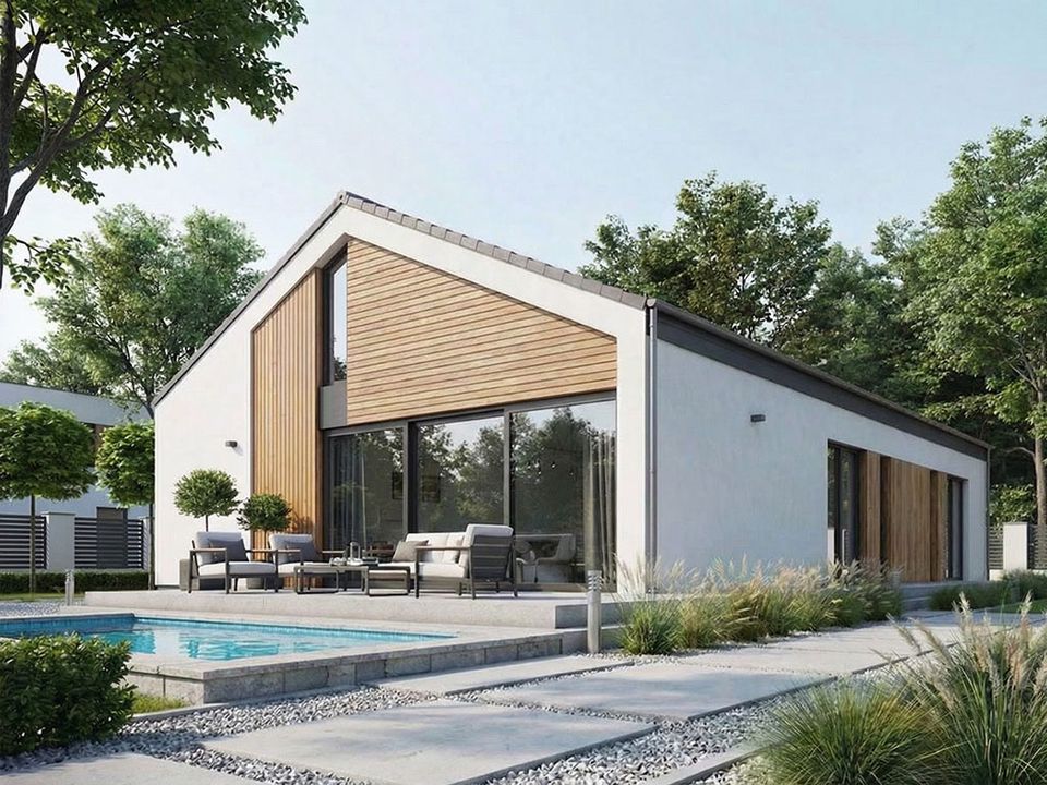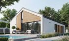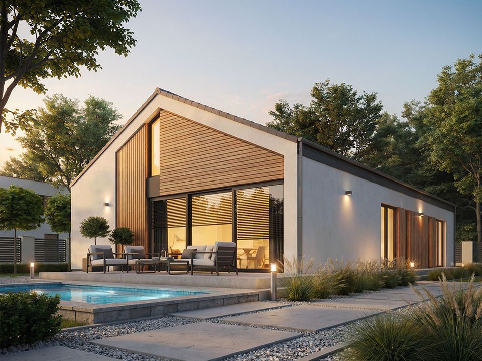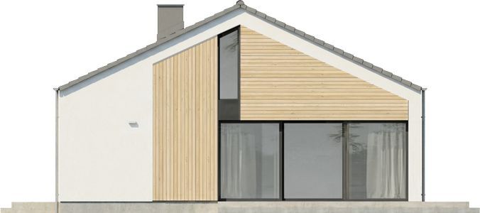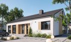 Dom zachwyca nowoczesną, elegancką elewacją łączącą biały tynk strukturalny z jasnymi deskami, a przestronne tarasy tworzą dodatkową strefę relaksu na świeżym powietrzu. STUDIO 102 wykonano w technologii murowanej z bloczków gazobetonowych, z dociepleniem styropianem i dachem dwuspadowym na drewnianej więźbie, co zapewnia trwałość, doskonałą izolację termiczną i komfort użytkowania przez wiele lat. To idealna propozycja dla osób poszukujących średniej wielkości domu parterowego, w którym codzienne życie łączy wygodę, estetykę i praktyczne rozwiązania.